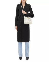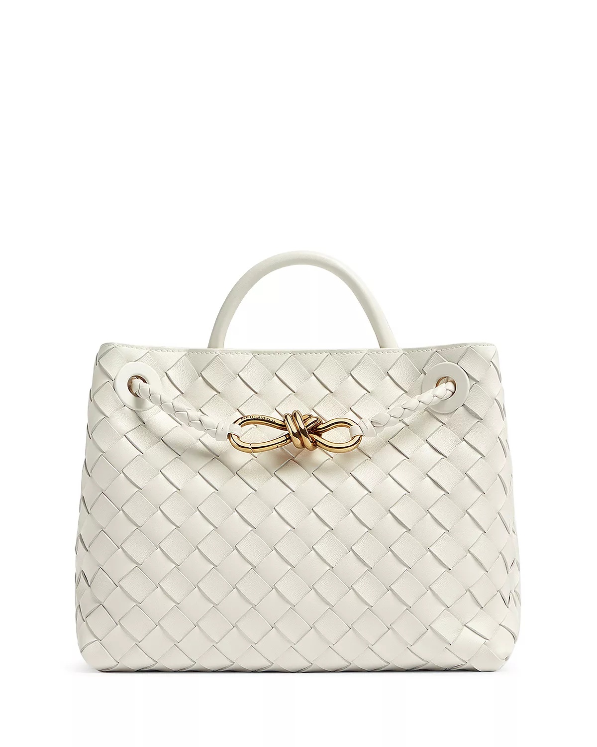 PRODUCT DETAILS - Top handle - Shoulder strap - Dimensions: 9.8"W x 4.13"D x 8.67"H - Magnetic tab closure - Two interior compartments - Interior zip pocket and slip pocket - Woven design - Brass-tone knot hardware - Leather - Made in Italy Web ID: 4622483