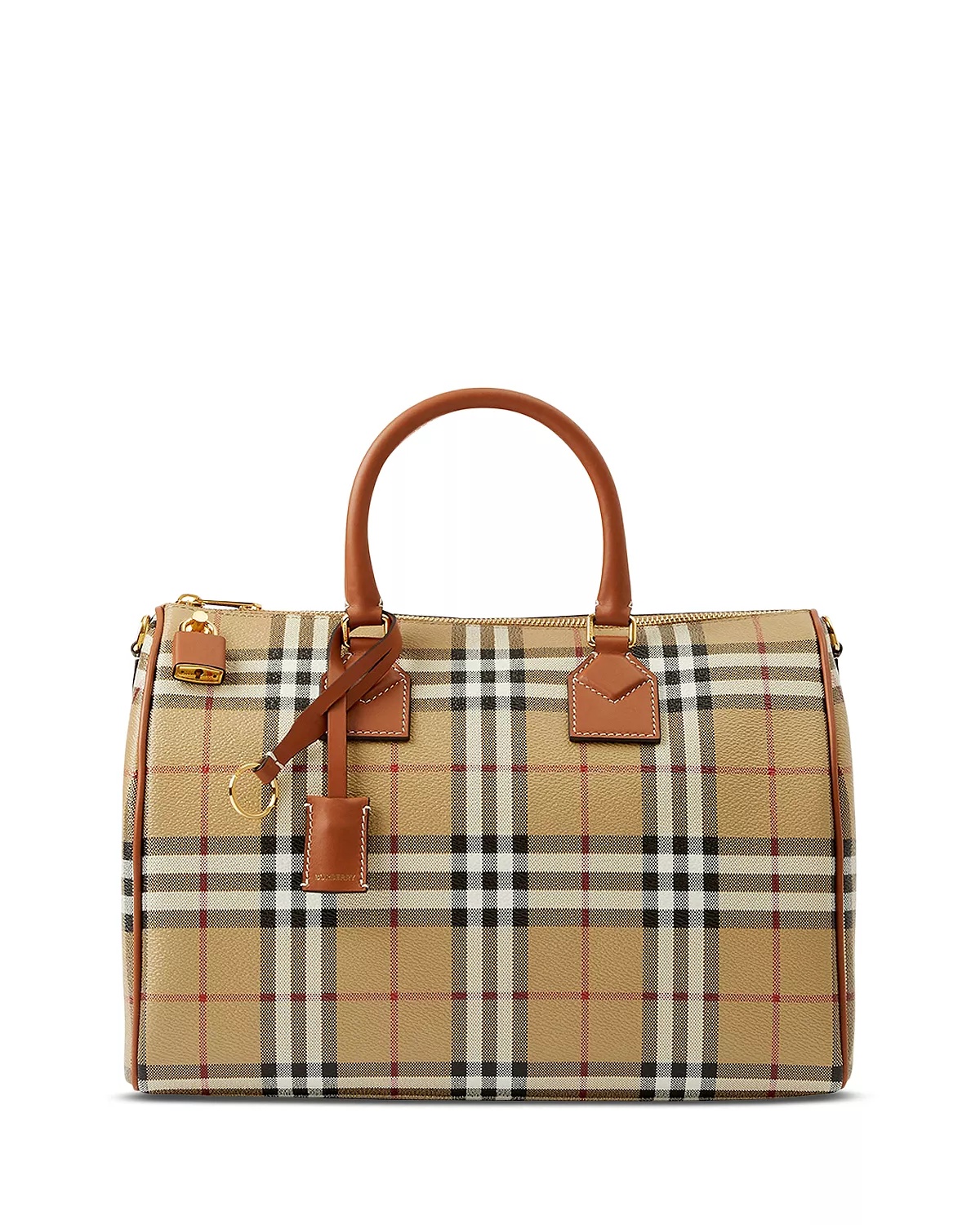 PRODUCT DETAILS - Double leather top handles - Adjustable removable crossbody strap, 14.8"-16.7" drop - Dimensions: 11.8"W x 5.9"D x 8.3"H - Zip closure - Signature Burberry Check, styled with a leather-wrapped padlock - Removable luggage tag with embossed Burberry lettering - Hand-painted edges - Polished metal hardware - Outer: 54% polyurethane, 35% cotton, 11% polyester; trim: 100% calf leather; lining: 100% cotton - Made in Italy Web ID: 4717909