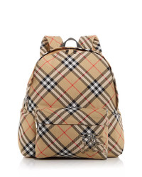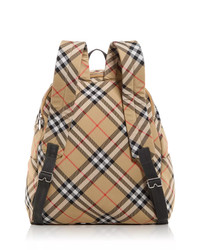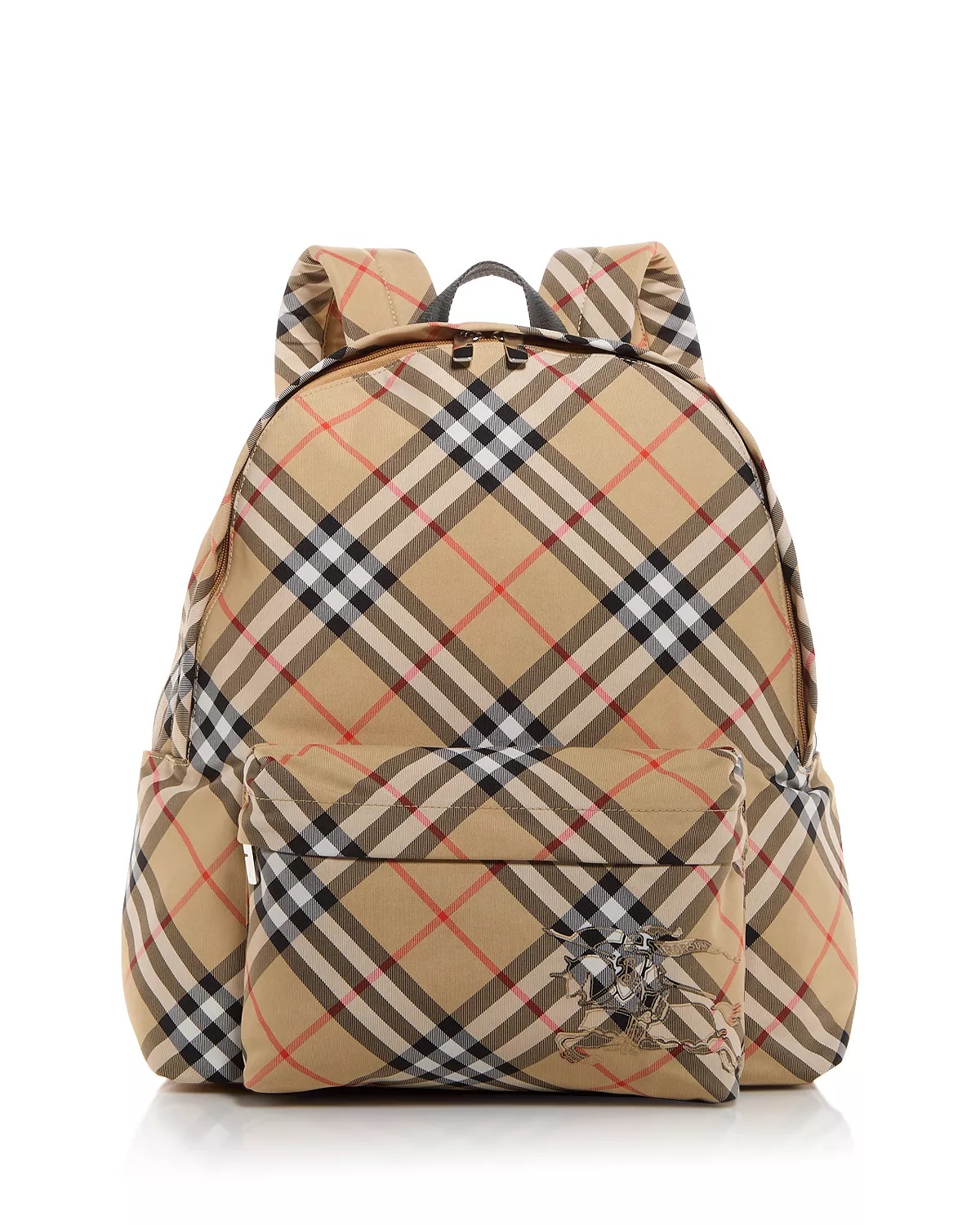 PRODUCT DETAILS - Top handle, 3" drop - Adjustable shoulder straps - Dimensions: 13.75"W x 5.5"D x 16"H - Two exterior zip pockets, two exterior slip pockets - Signature Burberry check - Embroidered Equestrian Knight Design at front pocket - Silver-tone hardware - Lined - Polyester/polyurethane - Imported Web ID: 5127672