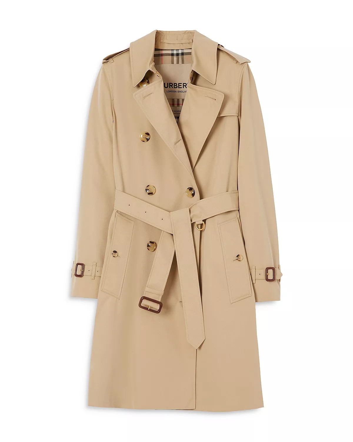 SIZE & FIT - Fits true to size, order your normal size PRODUCT DETAILS - Notch collar - Epaulets - Long sleeves - Front double-breasted button closures - Self-tie belt at waist - Side welt pockets - Shower-resistant fabric - Lined - Imported Web ID: 5378288 MATERIAL & CARE - Outer & lining: 100% cotton; sleeve lining: 100% viscose; buckles: leather - Dry clean