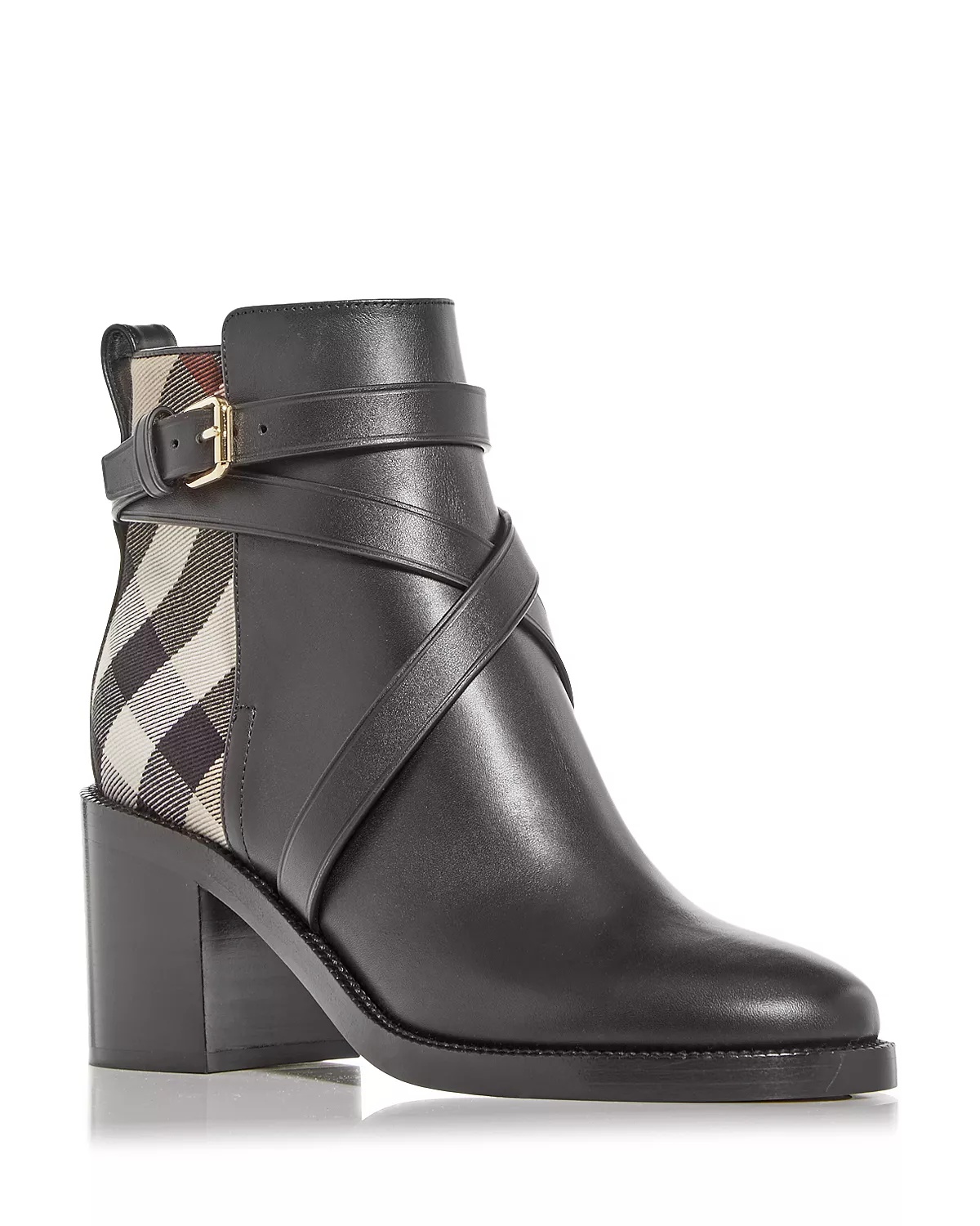 PRODUCT DETAILS - Fits true to size, order your normal size - Round toe - Criss-cross buckled ankle strap - Vintage check fabric panel at side - 3" stacked block heel - Leather and fabric upper, leather lining, leather and rubber sole - Made in Italy Web ID: 4459677