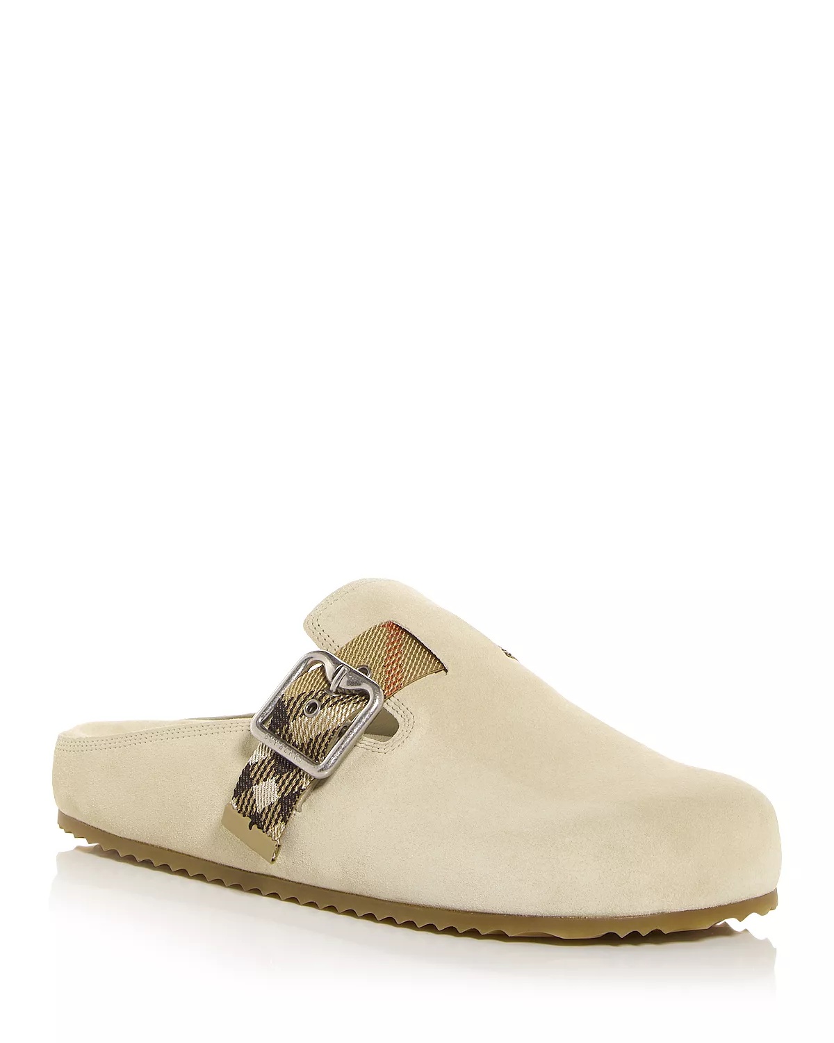 PRODUCT DETAILS - Fits true to size, order your normal size - Round toe - Slip on; buckled front strap - Signature check strap detailing - Suede upper, leather lining, rubber sole - Made in Italy Web ID: 5485560
