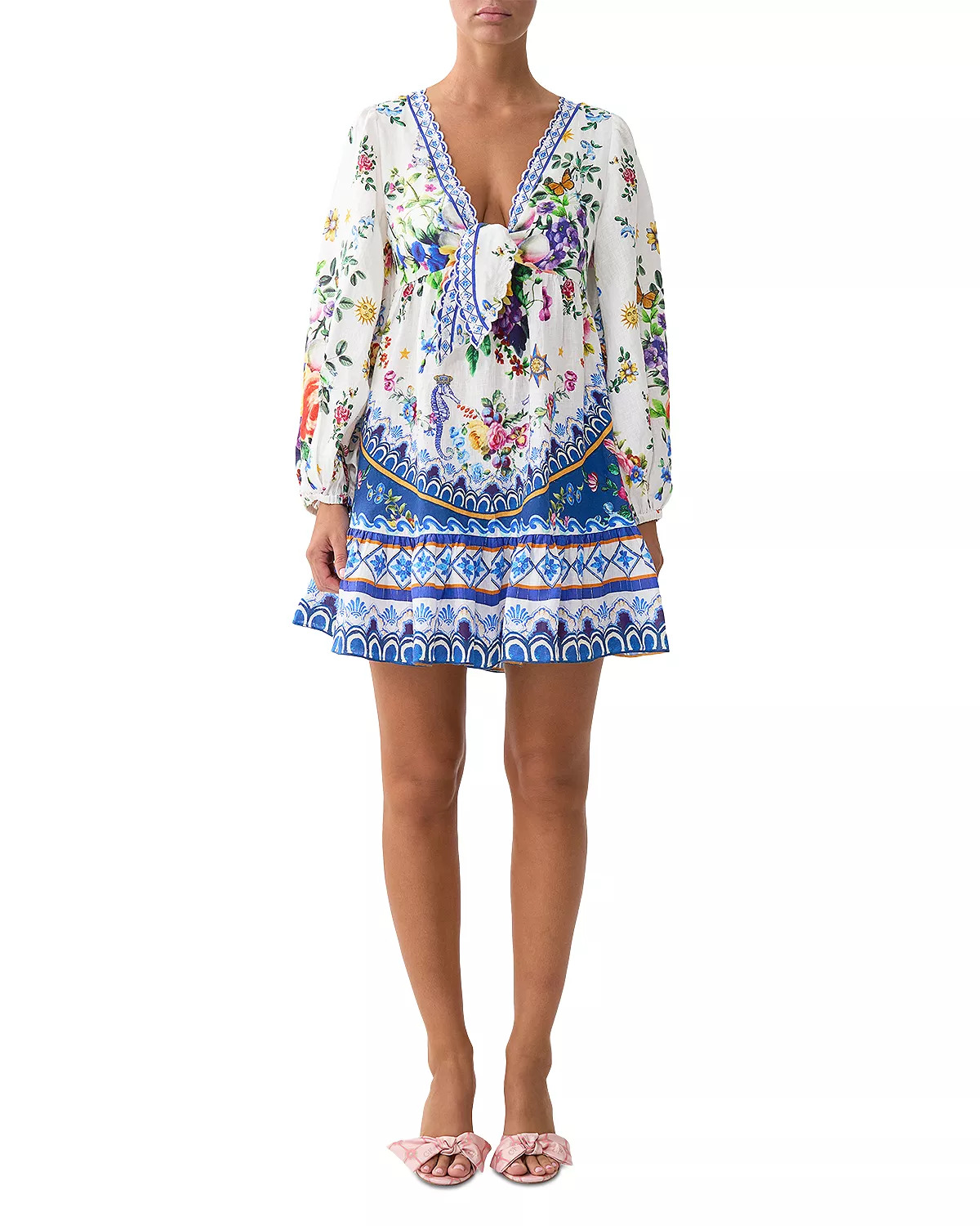 SIZE & FIT - Fits true to size, order your normal size - Relaxed at the bust, waist and hips - Designed for a mini length - Approx. 34" from high point shoulder to hem, based on a size small - Model measurements: 5'10" height, wearing a size small PRODUCT DETAILS - V-neck - Long blouson sleeves, elastic cuffs - Front tie closure - Allover mixed-print design - Made in India Web ID: 5541970 MATERIAL & CARE - 100% linen - Dry clean