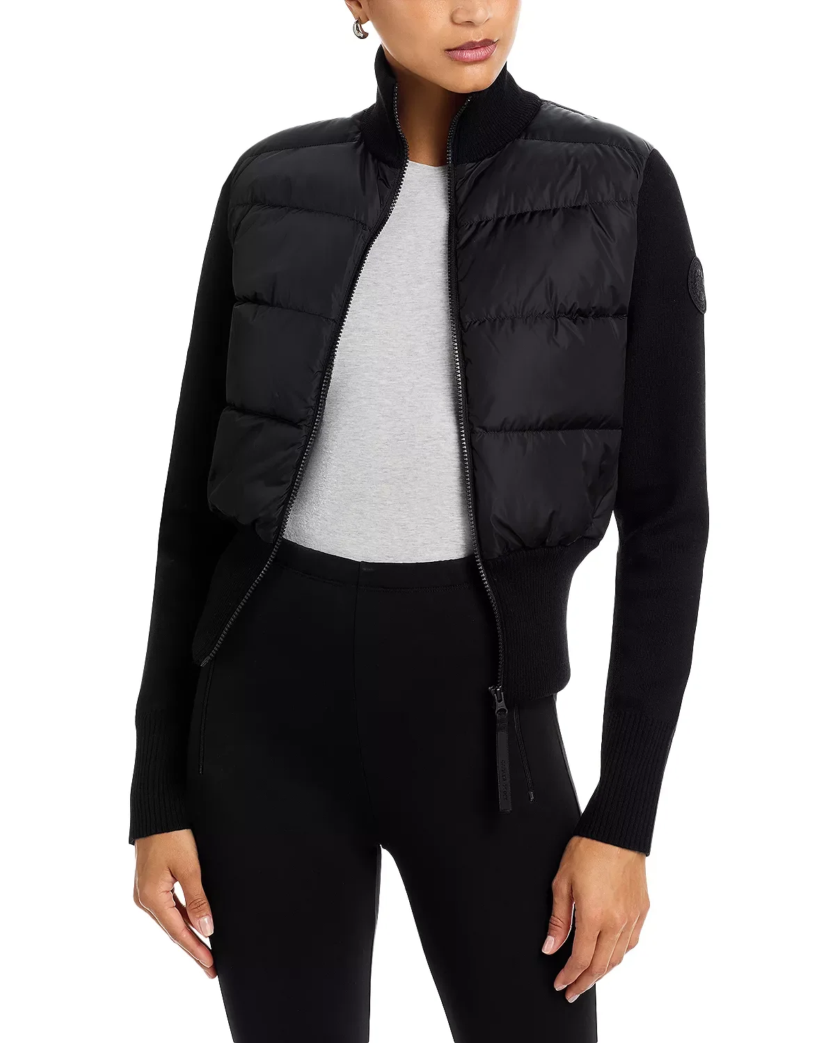 SIZE & FIT - Fits true to size, order your normal size - Designed to hit at hip - Model measurements: 5'10" height, 33.5" bust, 23.5" waist, 34.5" hips, wearing a size XS PRODUCT DETAILS - Ribbed stand collar, fixed hood - Long rib-knit sleeves - Front two-way zip closure - Two exterior zippered hand pockets - Adjustable drawcord at waist - Quilted design - Imported Web ID: 5667674 MATERIAL & CARE - Body: 100% nylon; collar, sleeves & hem: 100% wool; fill: 80% down/20% feathers - Dry clean