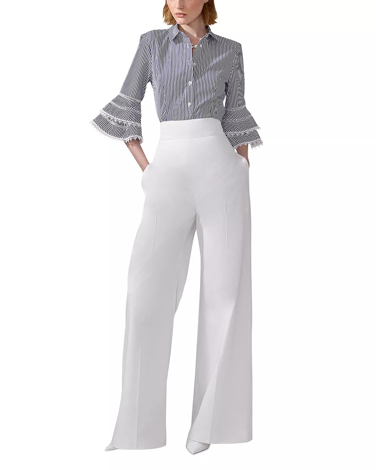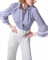 SIZE & FIT - Fits true to size, order your normal size PRODUCT DETAILS - Fold collar - Three-quarter sleeves with tiered, ruffled cuffs - Front button closures - Striped - Lace trim at ruffle edges - Made in India Web ID: 5520129 MATERIAL & CARE - 100% cotton - Dry clean