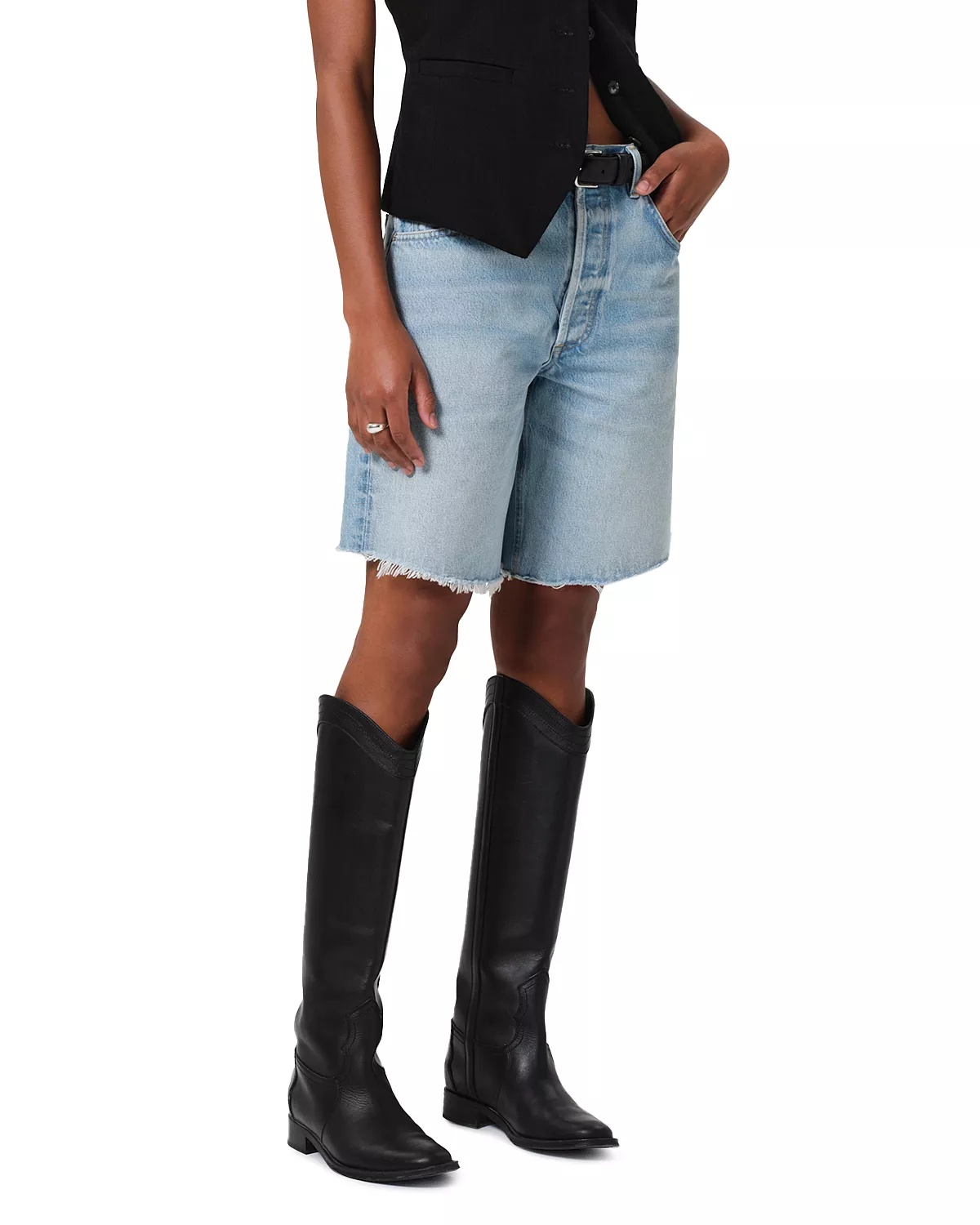 SIZE & FIT - Fits true to size, order your normal size - Rigid Jeans: This non-stretch denim provides a structured fit and takes time to break in. It will become more comfortable with each wear! - High rise: 12" - Short inseam: 10" - Leg opening: 23.5" - All measurements based on a size 27 - Model measurements: 5'10" height, 33" bust, 25" waist, 35" hips, wearing a size 27 PRODUCT DETAILS - Button fly with button closure, five-pocket silhouette - Contrast stitching, belt loops - Whiskered, faded - Frayed hems - Made in USA Web ID: 5416407 MATERIAL & CARE - 100% lyocell - Machine wash