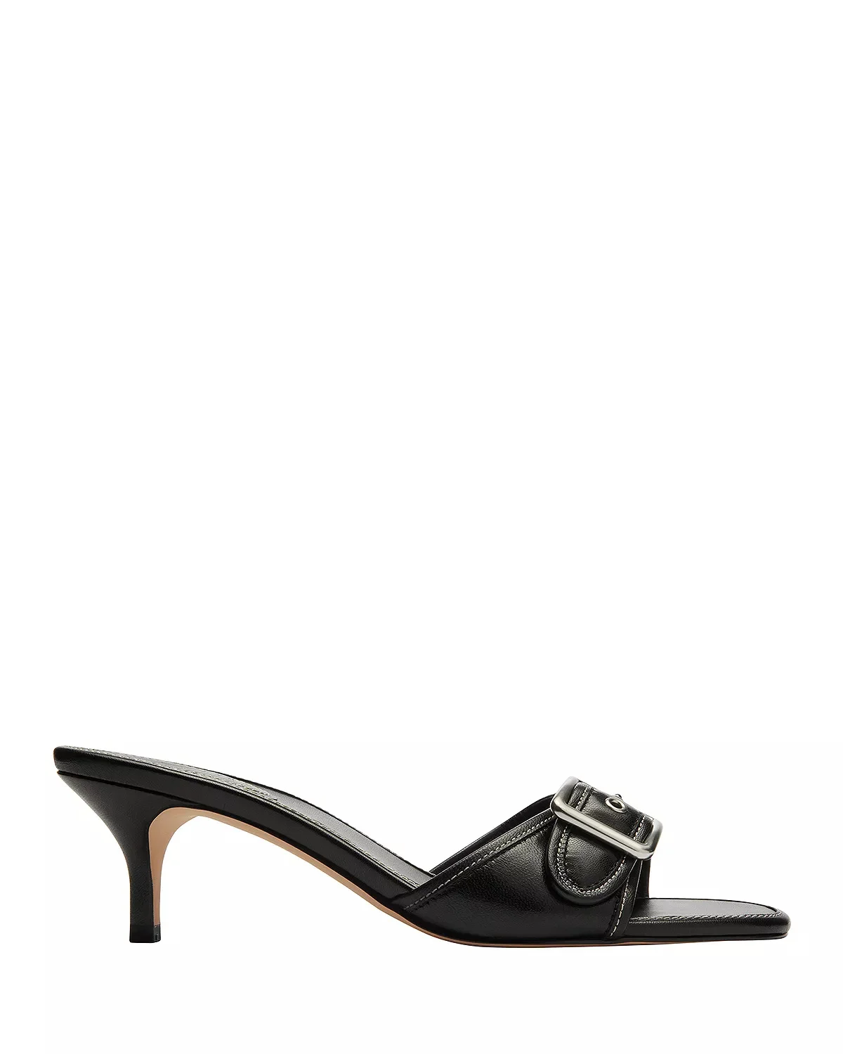 SIZE & FIT - Since its inception in 1941, American design house COACH has held steadfast to a simple mission of producing quality leather goods with a practical purpose. Award-winning Creative Director Stuart Vevers is at the helm today, - bringing COACH's reputation for masterful leatherworking into the future with fashion-forward designs that represent Vevers' love for pop culture. - The iconic collection of handbags, shoes, and accessories for men and women is steeped in authentic American style and lends practical luxury to the everyday. PRODUCT DETAILS - Fits true to size, order your normal size - Open square toe - Slip on - Buckle detailing - 2.25" heel - Leather upper, synthetic lining, leather sole - Imported Web ID: 5456046