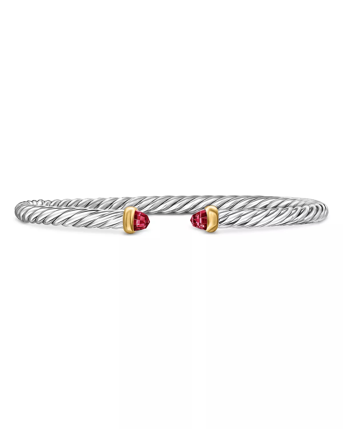 PRODUCT DETAILS - 4mm - From The Cable Collection® - Sterling silver, 14K yellow gold, Nitinol core to provide flex movement - Order according to your wrist measurement: extra small: 5-5.5"; small: 5.5-6"; medium: 6-6.5"; large: 6.5-7"; extra large: 7-7.5" - Almost all gemstones and blue and black diamonds have been treated to enhance their beauty and require special care - Photo may have been enlarged and/or enhanced. - All gemstone carat weights (ct. t.w.), if mentioned, are approximate; variance may be .05 carat - Items sold separately. - Made in USA Web ID: 5139774