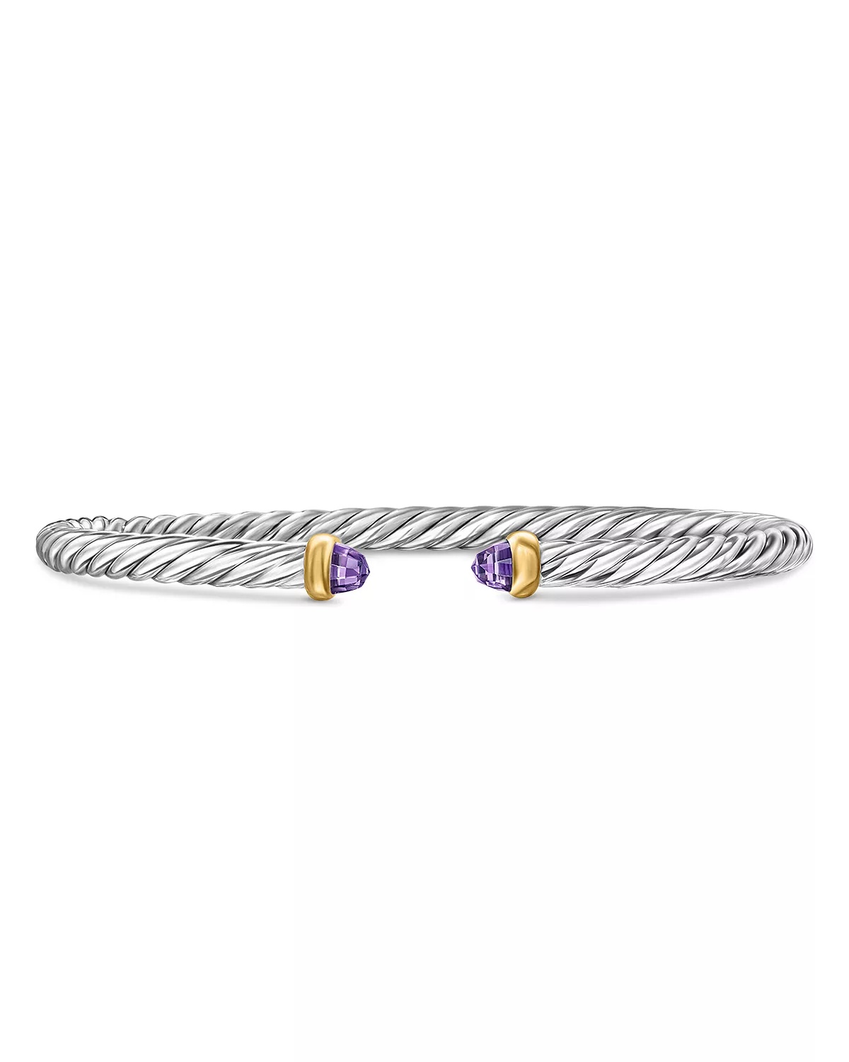PRODUCT DETAILS - 4mm - From The Cable Collection® - Sterling silver, 14K yellow gold, Nitinol core to provide flex movement - Order according to your wrist measurement: extra small: 5-5.5"; small: 5.5-6"; medium: 6-6.5"; large: 6.5-7"; extra large: 7-7.5" - Almost all gemstones and blue and black diamonds have been treated to enhance their beauty and require special care - Photo may have been enlarged and/or enhanced. - All gemstone carat weights (ct. t.w.), if mentioned, are approximate; variance may be .05 carat - Items sold separately. - Made in USA Web ID: 5139774