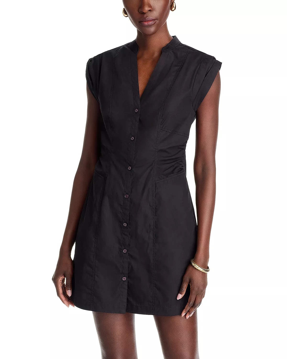 SIZE & FIT - Fits true to size, order your normal size - Designed for a mini length - Approx. 35" from high point of shoulder to hem - Model measurements: 5'10" height, 33" bust, 25" waist, 35" hips PRODUCT DETAILS - Collared V-neck - Button front closures - Short sleeves - Smocked at back waist - Side-slits - Imported Web ID: 5315345 MATERIAL & CARE - Cotton - Dry clean