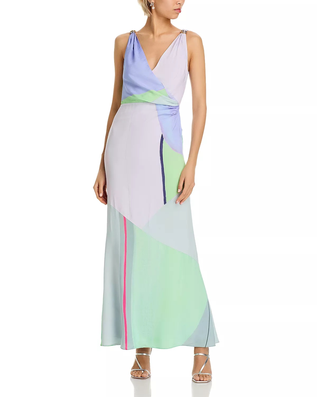 SIZE & FIT - Fits true to size, order your normal size - Designed for a floor-length look - Approx. 52" from high point shoulder to hem, based on a size small - Model measurements: 5'10" height, 33" bust, 25" waist, 35" hips, wearing a size 4 PRODUCT DETAILS - V-neck - Sleeveless, hardware accents at straps - Pullover style - Crossover bodice with side waist gather - Allover print - Lined - Imported Web ID: 5442080 MATERIAL & CARE - 74% cotton/12% polyester/12% polyamide/2% other fibers: lining: 100% polyester - Dry clean
