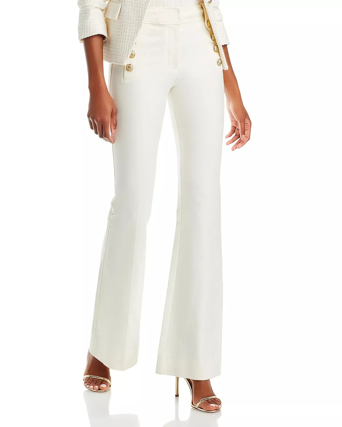 SIZE & FIT - Fits true to size, order your normal size - 10" rise, 32" inseam, 22" leg opening - Model measurements: 5'10" height, 33.5" bust, 23.5" waist, 34.5" hips, wearing a size 4 PRODUCT DETAILS - Zipper and hook closure at front - Belt loops - Side-seam pockets at hips - Embellished button details at front and belt loops - Flare-hem silhouette - Imported Web ID: 4798227