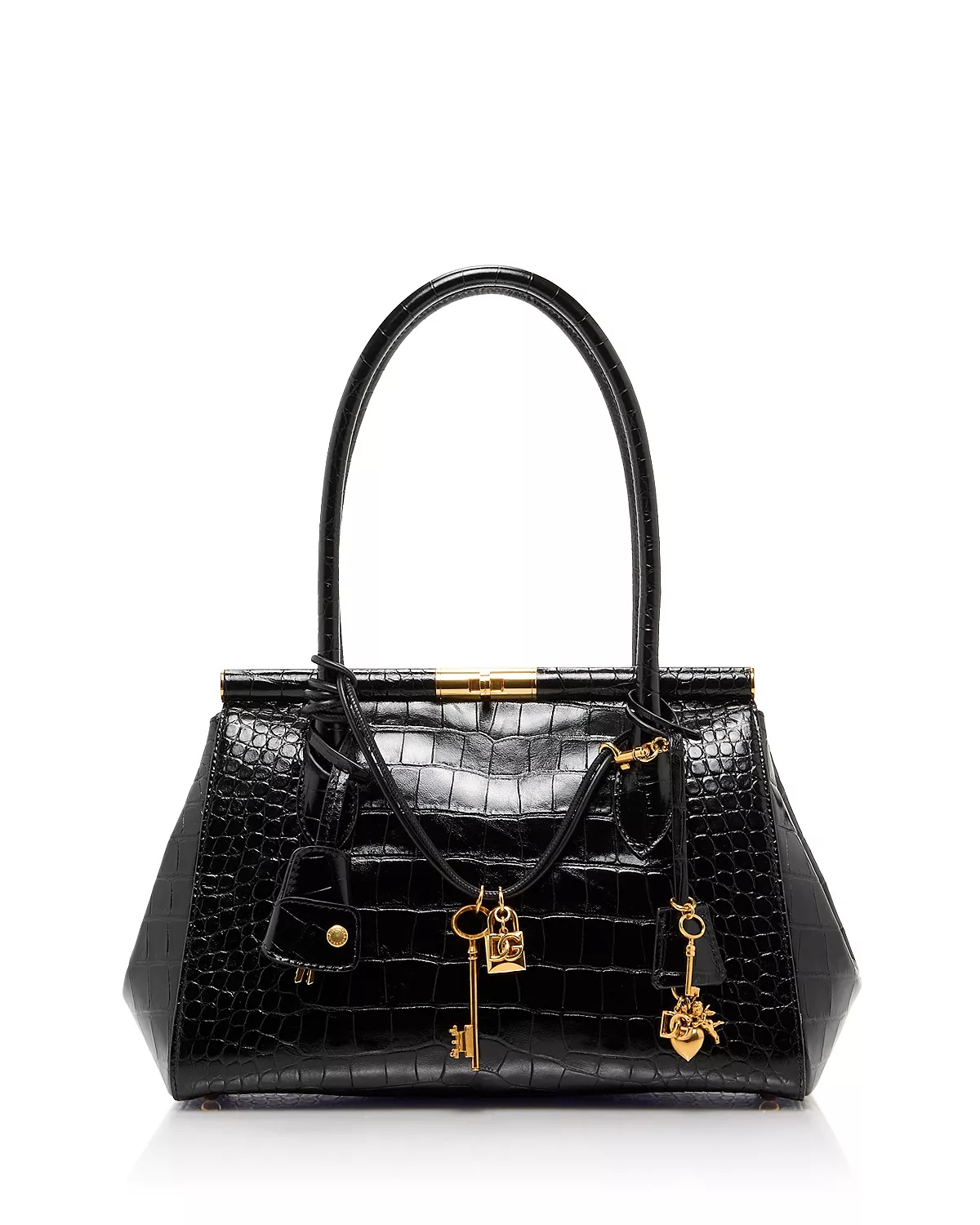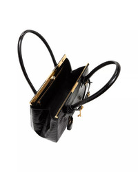 PRODUCT DETAILS - Top handles - Dimensions: 12"L x 5"D x 8"H - Frame closure with turn lock clasp - Interior zip pocket - Croc-embossed leather finish - Hanging key fob & decorative hardware - Lined - Leather - Made in Italy Web ID: 5291159