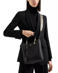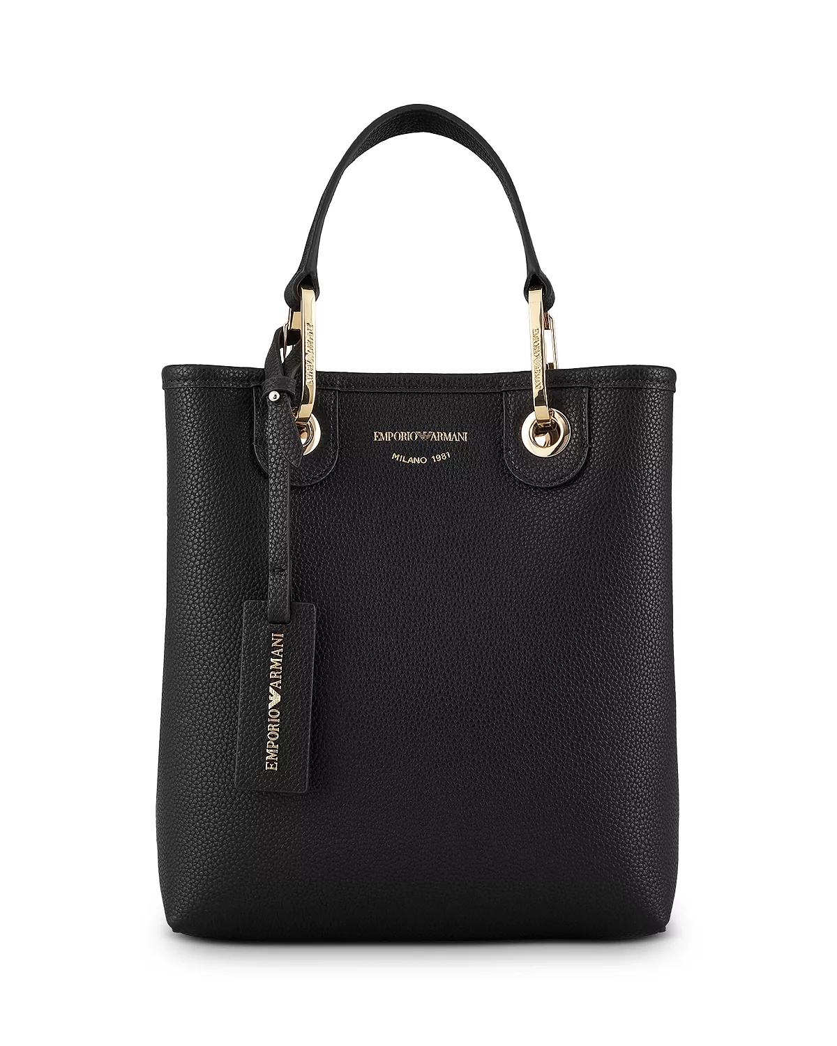 PRODUCT DETAILS - Top handles - Removable logo webbing strap - Dimensions: 8.50"W x 10"H x 4"D - Magnetic snap closure - Removable interior zip pouch - Embellished with removable gold-tone carabiner clips and tags with embossed logo lettering that match the bag - Mannequin model measurements: 5'10" height, wearing a size 4 or small - Imported Web ID: 4609646
