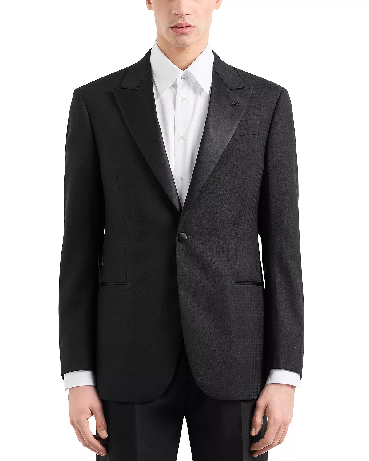 SIZE & FIT - Fits true to size - Designed for a regular fit PRODUCT DETAILS - Satin peak lapels - Long sleeves with four-button cuffs - Button closure - Two welt pockets at waist, welt pocket at chest - Side vents - Made in Italy Web ID: 4963798 MATERIAL & CARE - 100% virgin wool; lining: 68% acetate/32% polyester - Dry clean