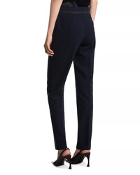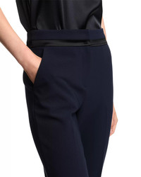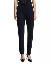 SIZE & FIT - Fits true to size, order your normal size PRODUCT DETAILS - Zip fly with hook-and-eye closure - Slim-leg silhouette - Two side slant pockets - Darted waist - Satin stripe around waist - Imported Web ID: 5604201 MATERIAL & CARE - 94% polyester/6% elastane; secondary fabric: 75% acetate/25% polyester; partial lining: 96% polyester/4% elastane - Dry clean