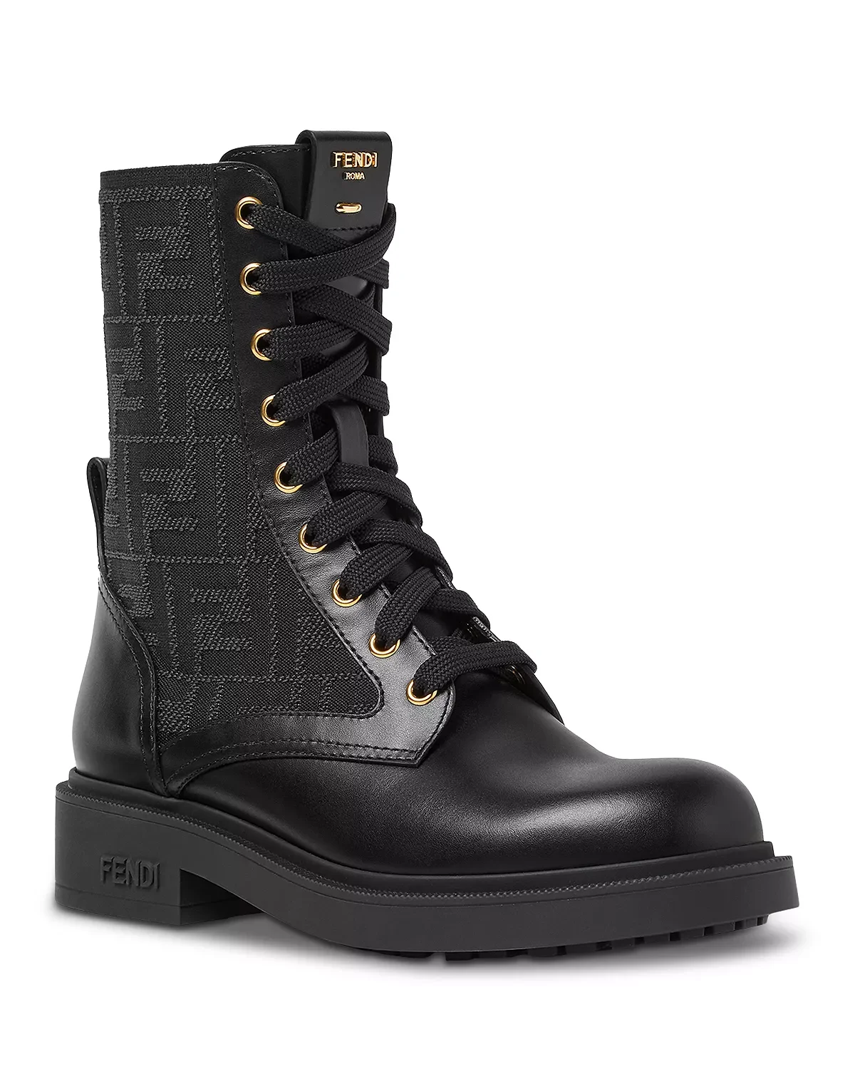 PRODUCT DETAILS - Fits true to size, order your normal size - Round toe - Lace up with metal eyelets and Fendi Roma lettering logo at tongue - Leather and stretch fabric upper with the iconic FF motif - Fendi lettering at rubber sole and Selleria Metal Stitch at heel - 1.37" heel - Leather/polyester/elastodiene/rubber upper, leather lining, rubber sole - Made in Italy Web ID: 5842787