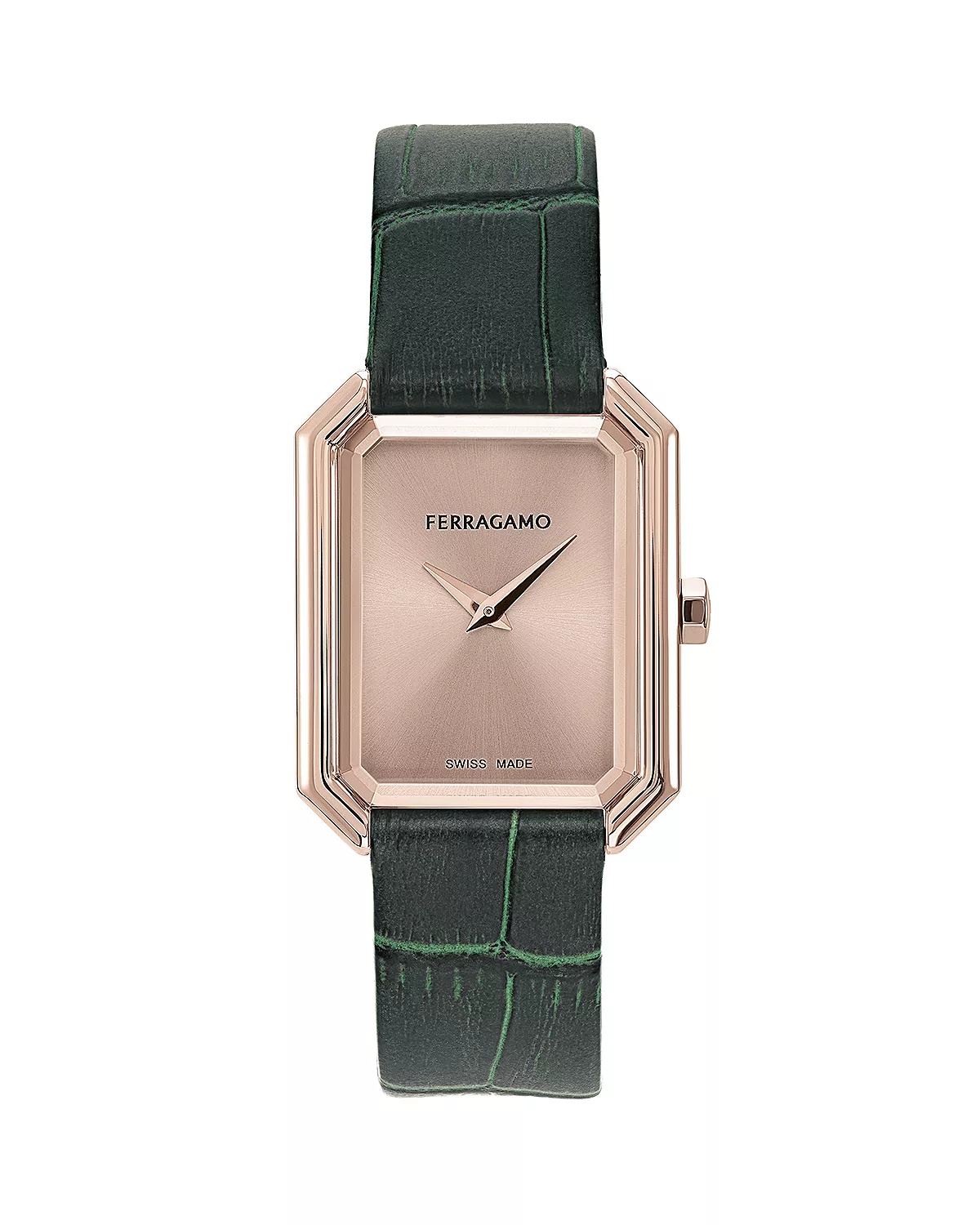 PRODUCT DETAILS - Rose gold-tone ionic plating; stainless steel; leather; sapphire crystal - Case size: 26.5mm x 33.5mm - Ardillon buckle closure - Water resistant to 3 ATM - Swiss quartz movement - Gold-tone dial - Deep green croc-embossed leather strap - Manufacturer's 2-year limited warranty + 2-year extension - Photo may have been enlarged and/or enhanced. - Made in Switzerland Web ID: 5052212