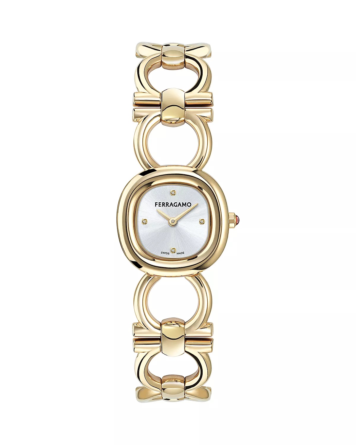 PRODUCT DETAILS - Gold IP; stainless steel; sapphire crystal - Case size: 25mm - Jewelry clasp closure - Water resistant to 3 ATM - Swiss quartz movement - Silver-tone dial - Gold IP stainless steel link bracelet - Manufacturer's two-year limited warranty - Photo may have been enlarged and/or enhanced - Made in Switzerland Web ID: 5486914