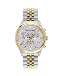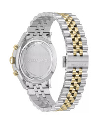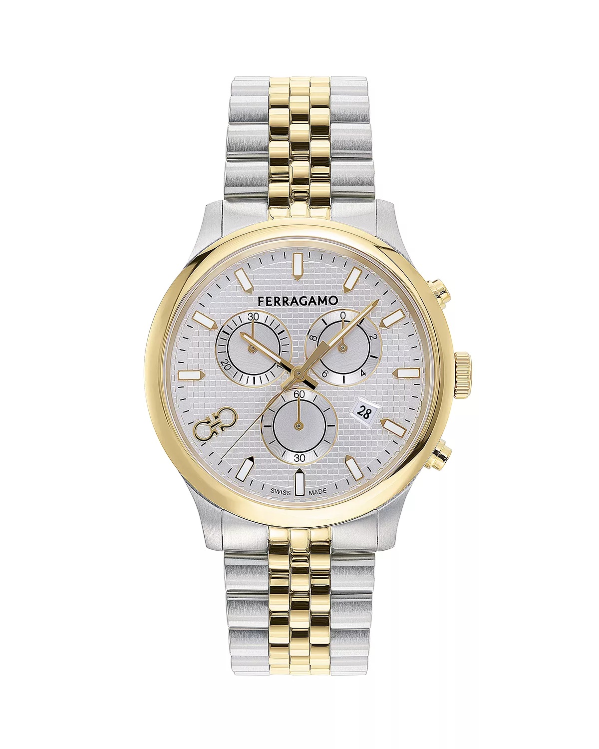 PRODUCT DETAILS - Gold-tone ionic plating; stainless steel; sapphire crystal - Case size: 42mm - Deployant clasp closure - Water resistant to 5 ATM - Swiss quartz chronograph movement - Silver-tone dial with date window at 4 o'clock - Three chronograph sub-dials & tachymeter bezel - Two-tone stainless steel link bracelet - Manufacturer's 2-year limited warranty + 2-year extension - Photo may have been enlarged and/or enhanced. - Made in Switzerland Web ID: 5052180