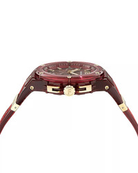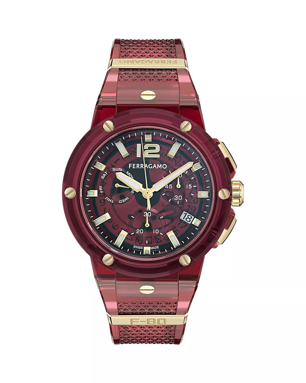PRODUCT DETAILS - Plastic; polyurethane; sapphire crystal - Case size: 44mm - Deployant clasp closure - Water resistant to 5 ATM - Swiss quartz chronograph movement - Burgundy dial with date display at 4 o'clock - 3 sub-dials - Burgundy polyurethane strap - Manufacturer's two-year limited warranty - Photo may have been enlarged and/or enhanced - Made in Switzerland Web ID: 5486916