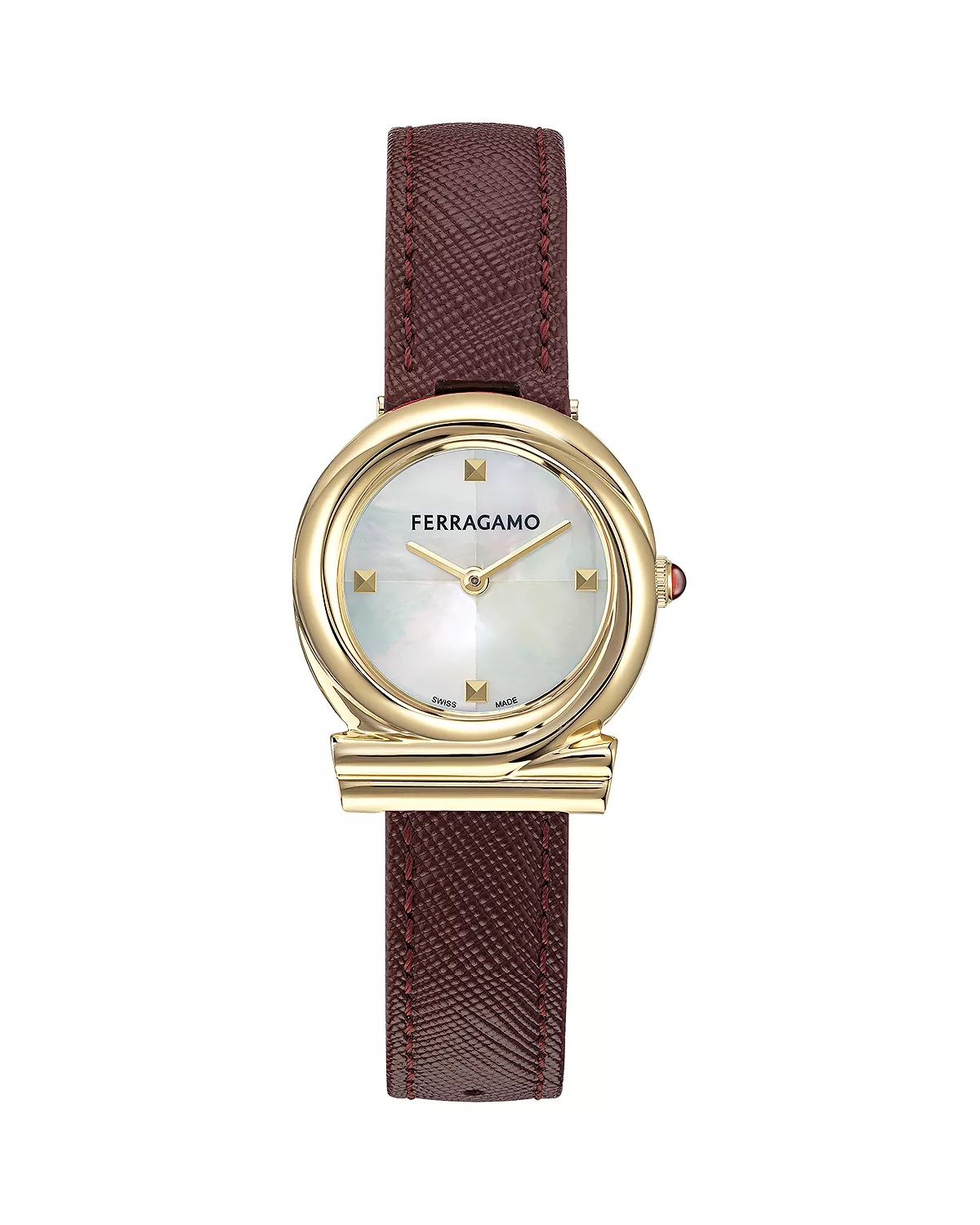 PRODUCT DETAILS - Gold IP; stainless steel; leather; sapphire crystal - Case size: 28mm - Ardillon buckle closure - Water resistant to 3 ATM - Swiss quartz movement - White mother-of-pearl dial - Burgundy saffiano leather strap - Manufacturer's two-year limited warranty - Photo may have been enlarged and/or enhanced - Made in Switzerland Web ID: 5486904