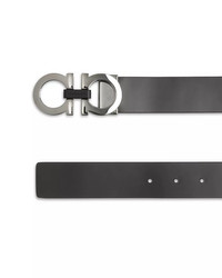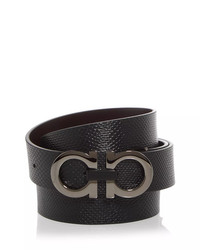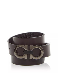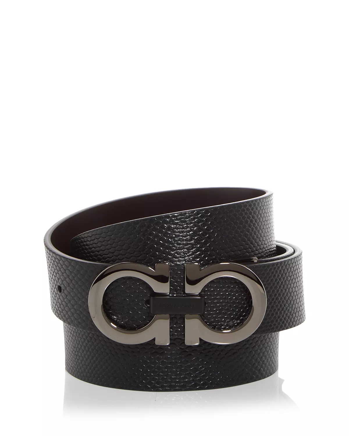 SIZE & FIT - Italian-born Salvatore Ferragamo dreamed of becoming a shoemaker, and started garnering acclaim in Old Hollywood crafting cowboy boots for Western films. - This cultivated relationships with A-list stars and helped catapult his creations beyond boots with spurs. - The designer's time-honored leatherworking skills and knowledge of anatomy led to the creation of a patented sole design that supported the natural curvature of the foot. - Three generations later, the label is still sought after for its handcrafted shoes and handbags—and innovative spirit. - Polished and refined, the sumptuous accessories often feature house staples like the Gancini bit and the Vara bow. PRODUCT DETAILS - 1.25" wide - Gunmetal-tone double Gancini buckle with peg closure - Keeper detail - Reverses from pebbled black to brown leather - Belt fits small, order two waist sizes up - Belt is adjustable and can be cut to size for a custom fit - Leather - Made in Italy Web ID: 5211468