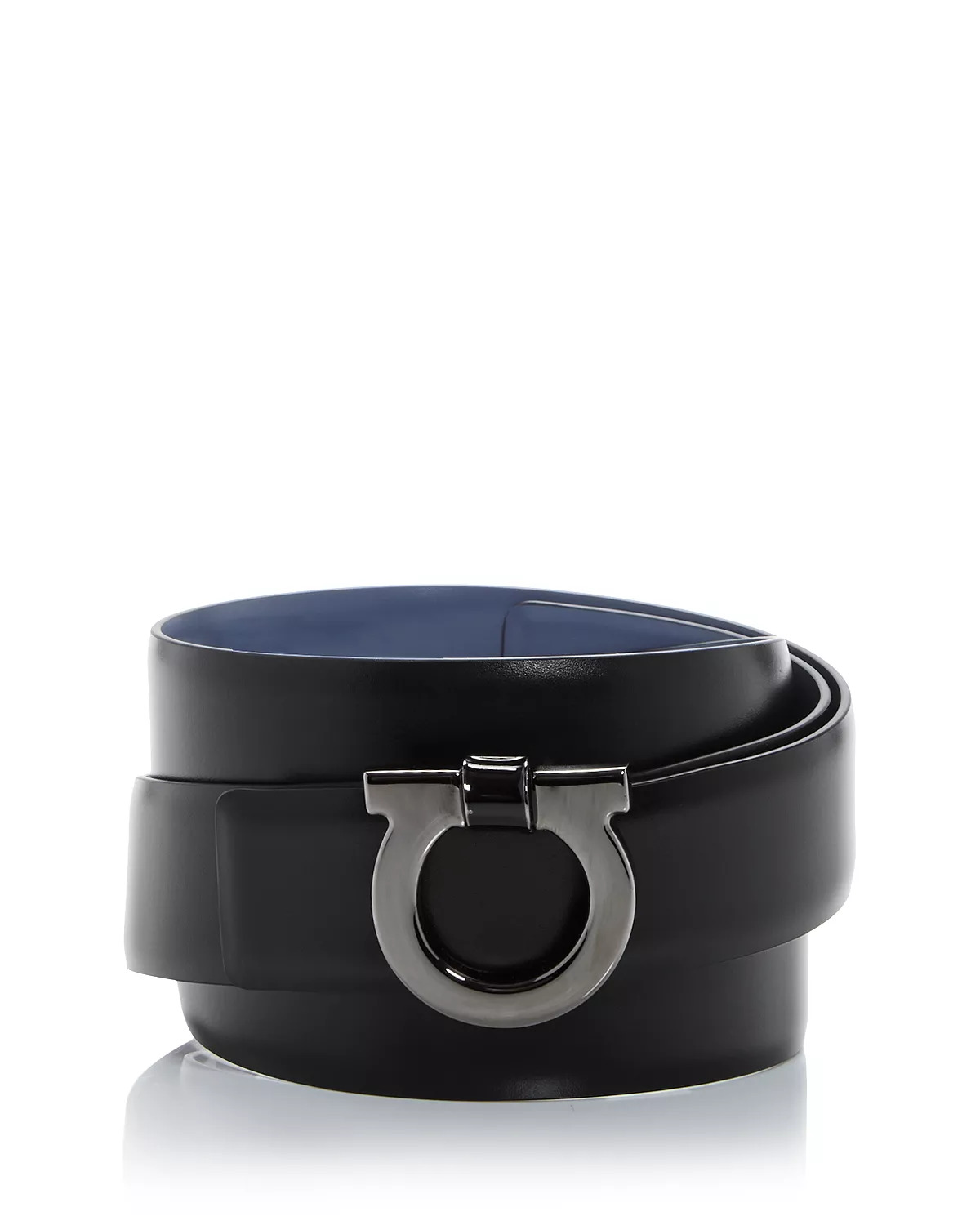 SIZE & FIT - Italian-born Salvatore Ferragamo dreamed of becoming a shoemaker, and started garnering acclaim in Old Hollywood crafting cowboy boots for Western films. - This cultivated relationships with A-list stars and helped catapult his creations beyond boots with spurs. - The designer's time-honored leatherworking skills and knowledge of anatomy led to the creation of a patented sole design that supported the natural curvature of the foot. - Three generations later, the label is still sought after for its handcrafted shoes and handbags—and innovative spirit. - Polished and refined, the sumptuous accessories often feature house staples like the Gancini bit and the Vara bow. PRODUCT DETAILS - 1.25" wide - Palladium-tone rotated Gancini buckle with peg closure - Reverses from black to blue leather - Belt fits small, order two waist sizes up - Belt is adjustable and can be cut to size for a custom fit - Leather - Made in Italy Web ID: 5437185