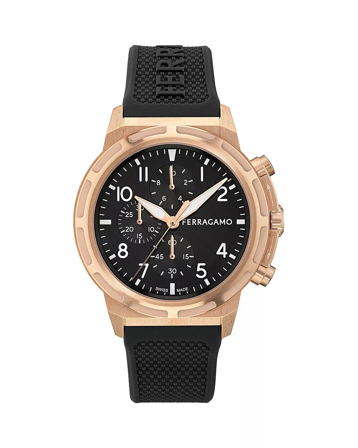 PRODUCT DETAILS - Rose gold IP; stainless steel; silicone; sapphire crystal - Case size: 44mm - Ardillon buckle closure - Water resistant to 10 ATM - Swiss quartz chronograph movement - Black dial - 3 sub-dials - Black silicone strap - Manufacturer's two-year limited warranty - Photo may have been enlarged and/or enhanced - Made in Switzerland Web ID: 5486900