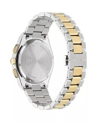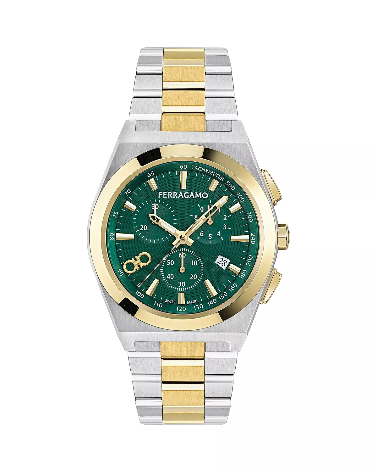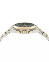 PRODUCT DETAILS - Gold IP; stainless steel; sapphire crystal - Case size: 42mm - Deployant clasp closure - Water resistant to 5 ATM - Swiss quartz chronograph movement - Green dial with date display at 4 o'clock - 3 sub-dials; gold IP bezel - Two-tone stainless steel link bracelet - Manufacturer's two-year limited warranty - Photo may have been enlarged and/or enhanced. - Made in Switzerland Web ID: 5267259