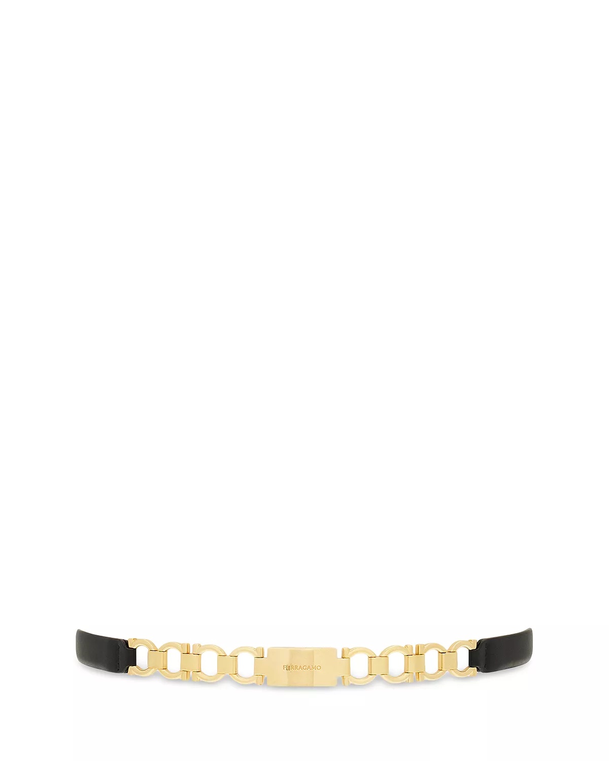 PRODUCT DETAILS - 0.7" width - The length is adjustable; please view the Ferragamo size guide for further details. - Sliding leather adjustment at back - Gold-tone chain of Gancini links at front - Central buckle closure - Leather - Made in Italy Web ID: 5209940