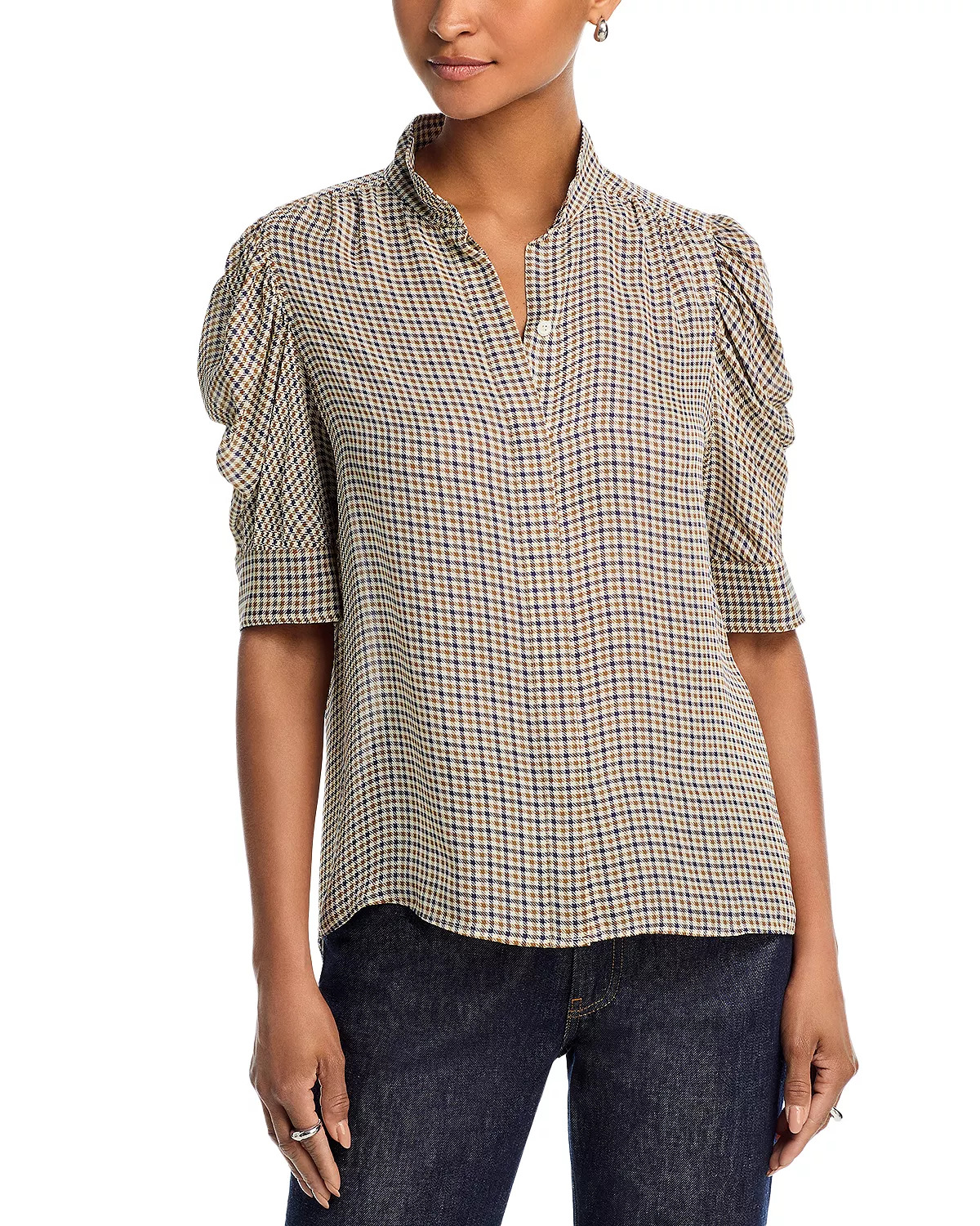 SIZE & FIT - Fits true to size, order your normal size - Model measurements: 5'10" height, 33.5" bust, 23.5" waist, 34.5" hips, wearing a size small PRODUCT DETAILS - Band collar - Front button closures - Short draped puff-shoulder sleeves - Houndstooth print - Imported Web ID: 5573209 MATERIAL & CARE - 100% silk - Dry clean