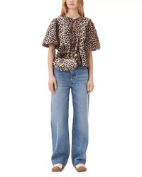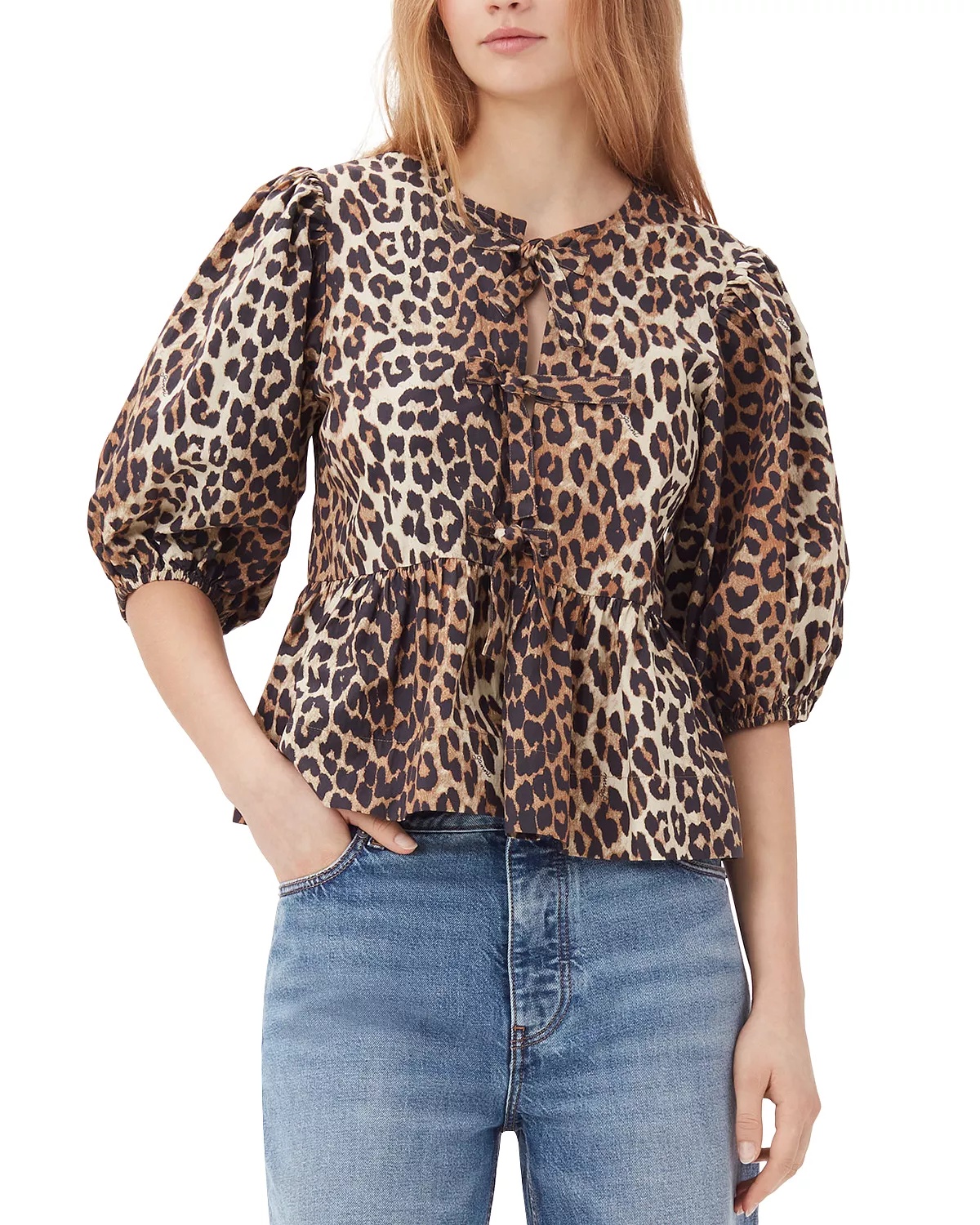 LEOPARD COTTON POPLIN PEPLUM TIE BLOUSE