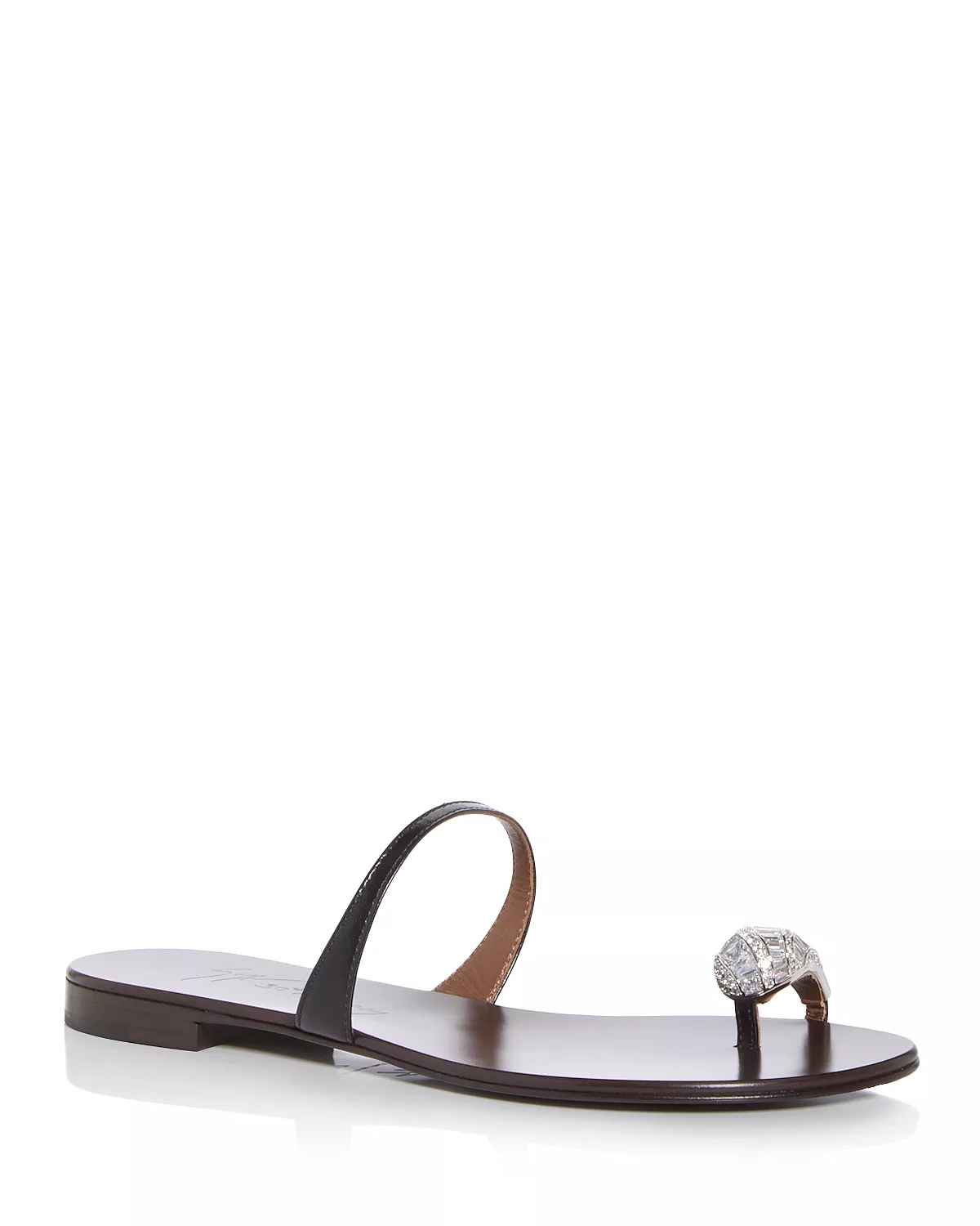 PRODUCT DETAILS - Fits true to size, order your normal size - Open toe; toe ring - Slip on - Crystal embellishment at toe - Leather upper, lining and sole - Made in Italy Web ID: 5395866