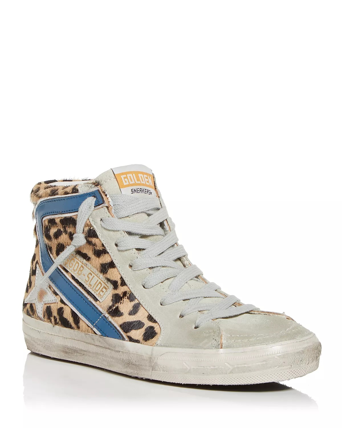PRODUCT DETAILS - Fits true to size, order your normal size - Padded collar for optimal comfort - Lace up, functional side zip - Signature distressed upper and sole edge, for a lived-in look - Signature metallic star at side - Leopard print real calf hair upper - Blue leather trim at side - Black suede heel tab - GGDB SLIDE branding at side and GOLDEN SNEAKERS label at tongue - Real calf hair, origin: France, dyed - Real calf hair and leather upper, leather lining, rubber sole - Made in Italy Web ID: 4456785