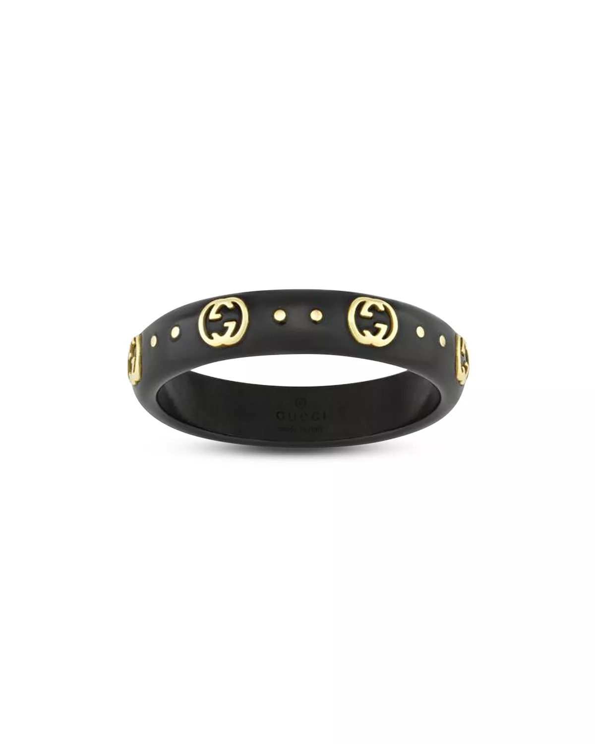 PRODUCT DETAILS - From the Icon collection - Classic GG logo on black synthetic corundum or white zirconia - Black synthetic corundum - White zirconia - 18K yellow gold - Width: 4mm - Almost all gemstones and blue and black diamonds have been treated to enhance their beauty and require special care - Photo may have been enlarged and/or enhanced - All gemstone carat weights (ct. t.w.) are approximate; variance may be 0.05 carat. - Made in Italy Web ID: 4174461