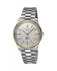 SIZE & FIT - Founded in Florence in 1921, Gucci is one of the world's leading luxury fashion brands, with a renowned reputation for creativity, innovation, and Italian craftsmanship. - Reflecting and defining the styles and attitudes of each era, Gucci has influenced fashion and culture for more than a century. PRODUCT DETAILS - Stainless steel; sapphire crystal - Case size: 40mm - Butterfly clasp closure - Water resistant to 5 ATM - Swiss automatic movement with power reserve of 42 hours - Silvery white dial - Seconds sub-dial - Stainless steel link bracelet - Manufacturer's 2-year limited warranty - Photo may have been enlarged and/or enhanced. - Made in Switzerland Web ID: 5014482