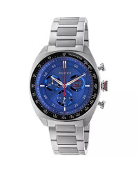 SIZE & FIT - Founded in Florence in 1921, Gucci is one of the world's leading luxury fashion brands, with a renowned reputation for creativity, innovation, and Italian craftsmanship. - Reflecting and defining the styles and attitudes of each era, Gucci has influenced fashion and culture for more than a century. PRODUCT DETAILS - Stainless steel; sapphire crystal - Case size: 41mm - Butterfly closure - Water resistant to 5 ATM - Swiss quartz chronograph movement - Blue dial - 3 sub-dials; black tachymeter bezel - Stainless steel link bracelet - Manufacturer's two-year limited warranty - Photo may have been enlarged and/or enhanced. - Made in Switzerland Web ID: 5164278