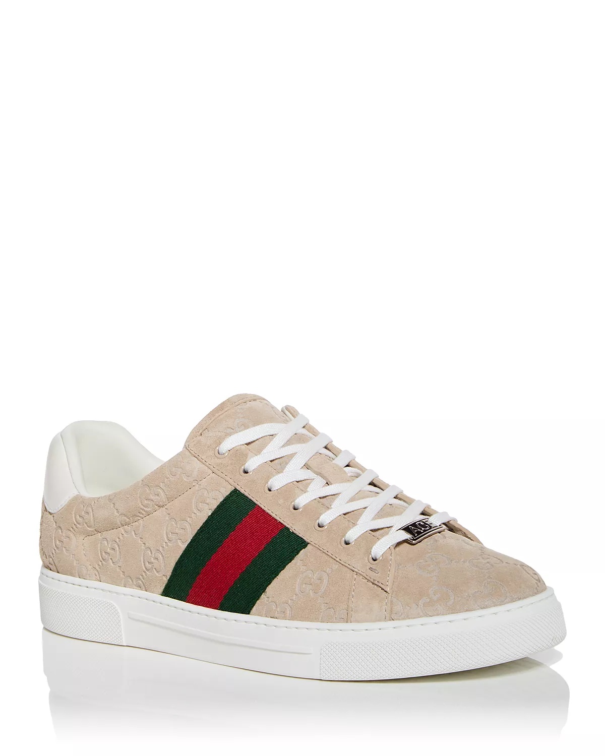 SIZE & FIT - Founded in Florence in 1921, Gucci is one of the world's leading luxury fashion brands, with a renowned reputation for creativity, innovation, and Italian craftsmanship. - Reflecting and defining the styles and attitudes of each era, Gucci has influenced fashion and culture for more than a century. PRODUCT DETAILS - Fits true to size, order your normal size - Padded tongue and collar for optimal comfort - Lace up - Logo at charm at laces; logo at heel - Signature embossed GG monogram with stripe webbing at sides - Suede and fabric upper, leather lining, rubber sole - Made in Italy Web ID: 5140716