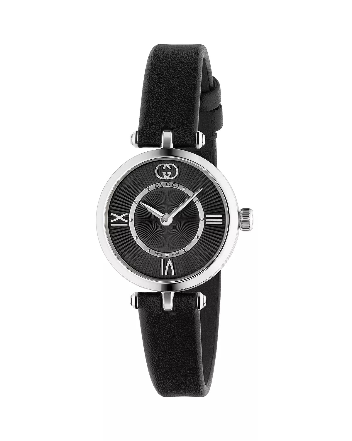 SIZE & FIT - Founded in Florence in 1921, Gucci is one of the world's leading luxury fashion brands, with a renowned reputation for creativity, innovation, and Italian craftsmanship. - Reflecting and defining the styles and attitudes of each era, Gucci has influenced fashion and culture for more than a century. PRODUCT DETAILS - Stainless steel; leather; sapphire crystal - Case size: 24mm - Buckle closure - Water resistant to 5 ATM - Swiss quartz movement - Black textured dial - Black leather strap - Manufacturer's 2-year limited warranty - Photo may have been enlarged and/or enhanced. - Made in Switzerland Web ID: 5378447