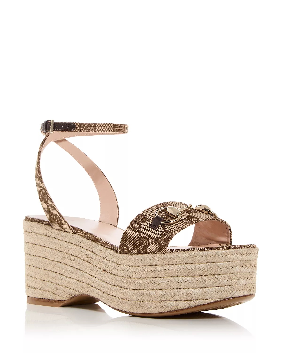 SIZE & FIT - Founded in Florence in 1921, Gucci is one of the world's leading luxury fashion brands, with a renowned reputation for creativity, innovation, and Italian craftsmanship. - Reflecting and defining the styles and attitudes of each era, Gucci has influenced fashion and culture for more than a century. PRODUCT DETAILS - Fits true to size, order your normal size - Open toe - Buckled ankle strap - Signature GG monogram with horsebit hardware at toe - Braided jute midsole - 3" wedge heel, 1.75" platform, feels like 1.25" heel - Fabric upper, leather lining, rubber sole - Made in Spain Web ID: 5328381