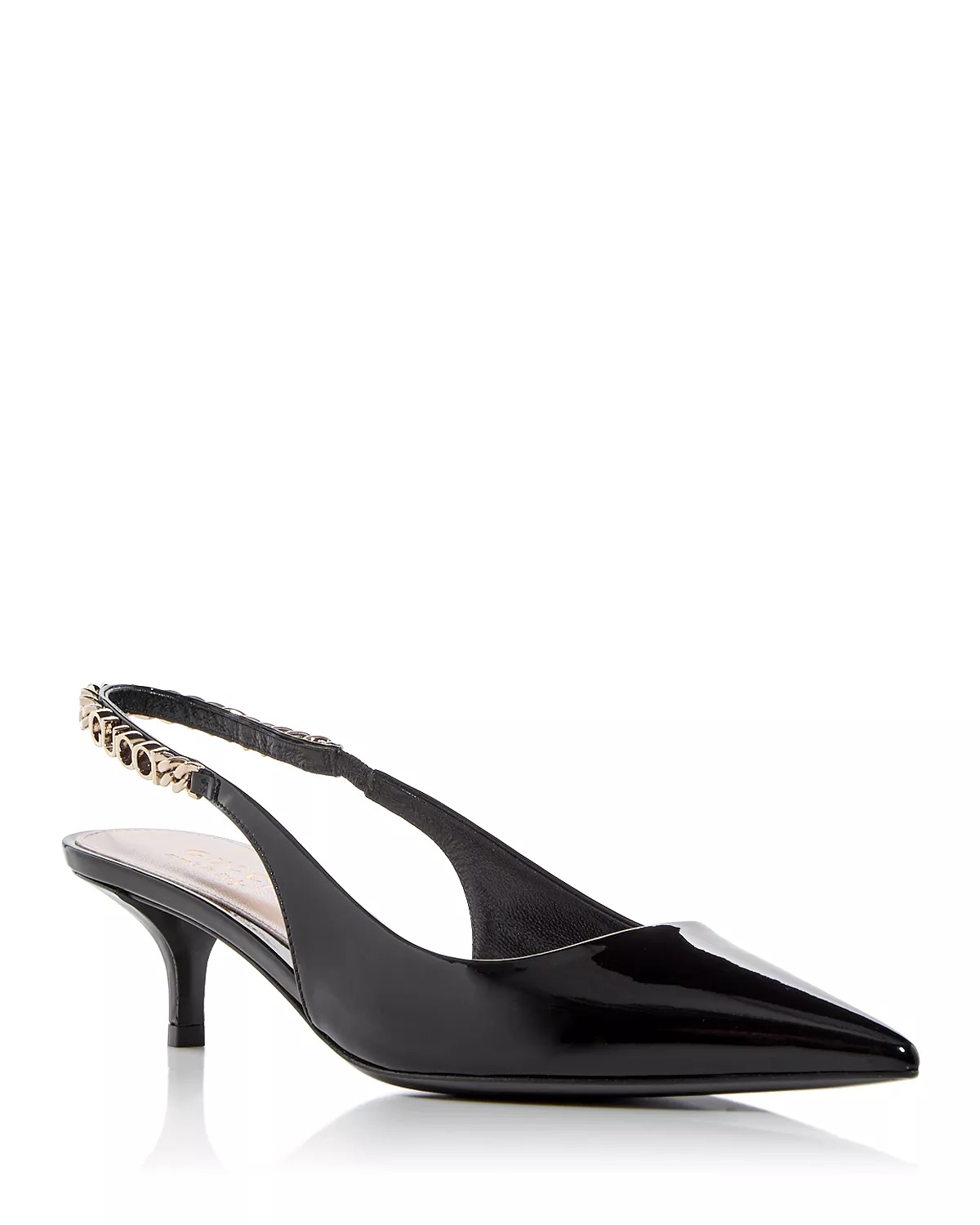 SIZE & FIT - Founded in Florence in 1921, Gucci is one of the world's leading luxury fashion brands, with a renowned reputation for creativity, innovation, and Italian craftsmanship. - Reflecting and defining the styles and attitudes of each era, Gucci has influenced fashion and culture for more than a century. PRODUCT DETAILS - Fits true to size, order your normal size - Elasticized slingback strap for a flexible fit - Pointed toe - Logo and chain hardware at strap - 1.75" kitten heel - Leather upper, lining and sole - Made in Italy Web ID: 5025833