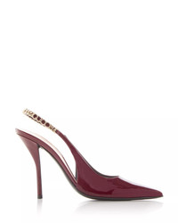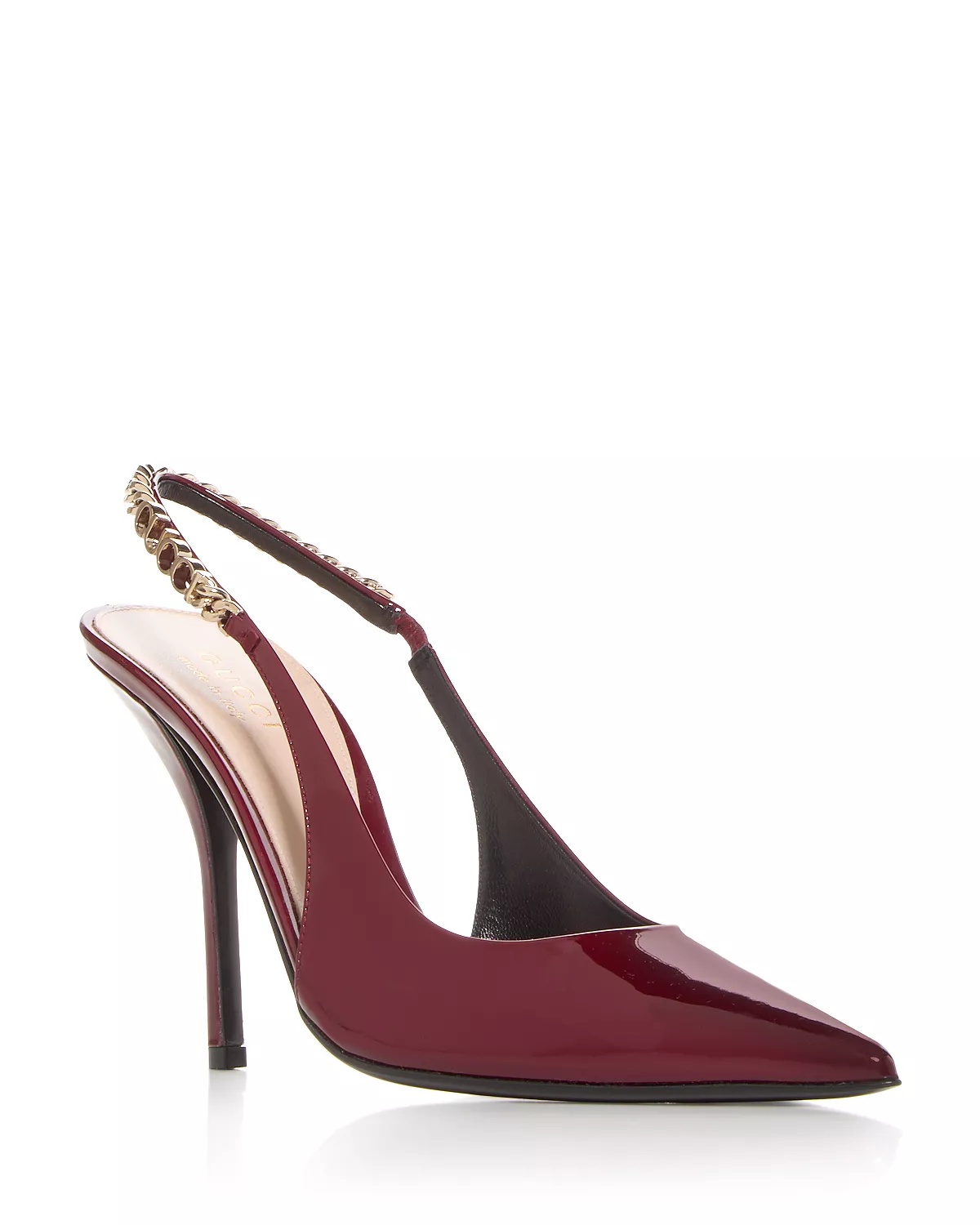 SIZE & FIT - Founded in Florence in 1921, Gucci is one of the world's leading luxury fashion brands, with a renowned reputation for creativity, innovation, and Italian craftsmanship. - Reflecting and defining the styles and attitudes of each era, Gucci has influenced fashion and culture for more than a century. PRODUCT DETAILS - Fits true to size, order your normal size - Elasticized slingback strap for a flexible fit - Pointed toe - Logo and chain hardware at strap - 4.5" stiletto heel - Leather upper, lining and sole - Made in Italy Web ID: 5025836