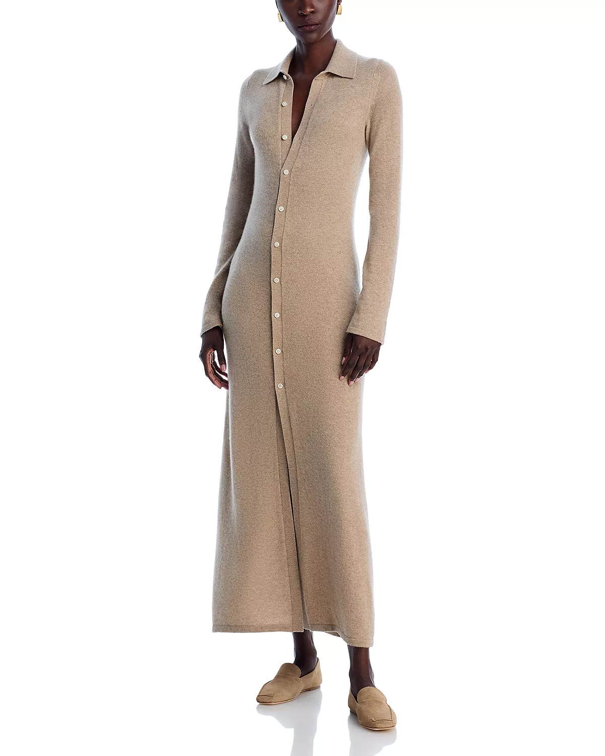 SIZE & FIT - Fits true to size, order your normal size - Fitted at bust and waist, relaxed at the hips - Designed to hit at ankles - Approx. 53" from high point shoulder to hem, based on a size small - Model measurements: 5'10" height, 33.5" bust, 23.5" waist, 34.5" hips, wearing a size small PRODUCT DETAILS - Collared - Long sleeves - Front button closures - Shirtdress silhouette - Imported Web ID: 5542947 MATERIAL & CARE - 100% cashmere - Hand wash