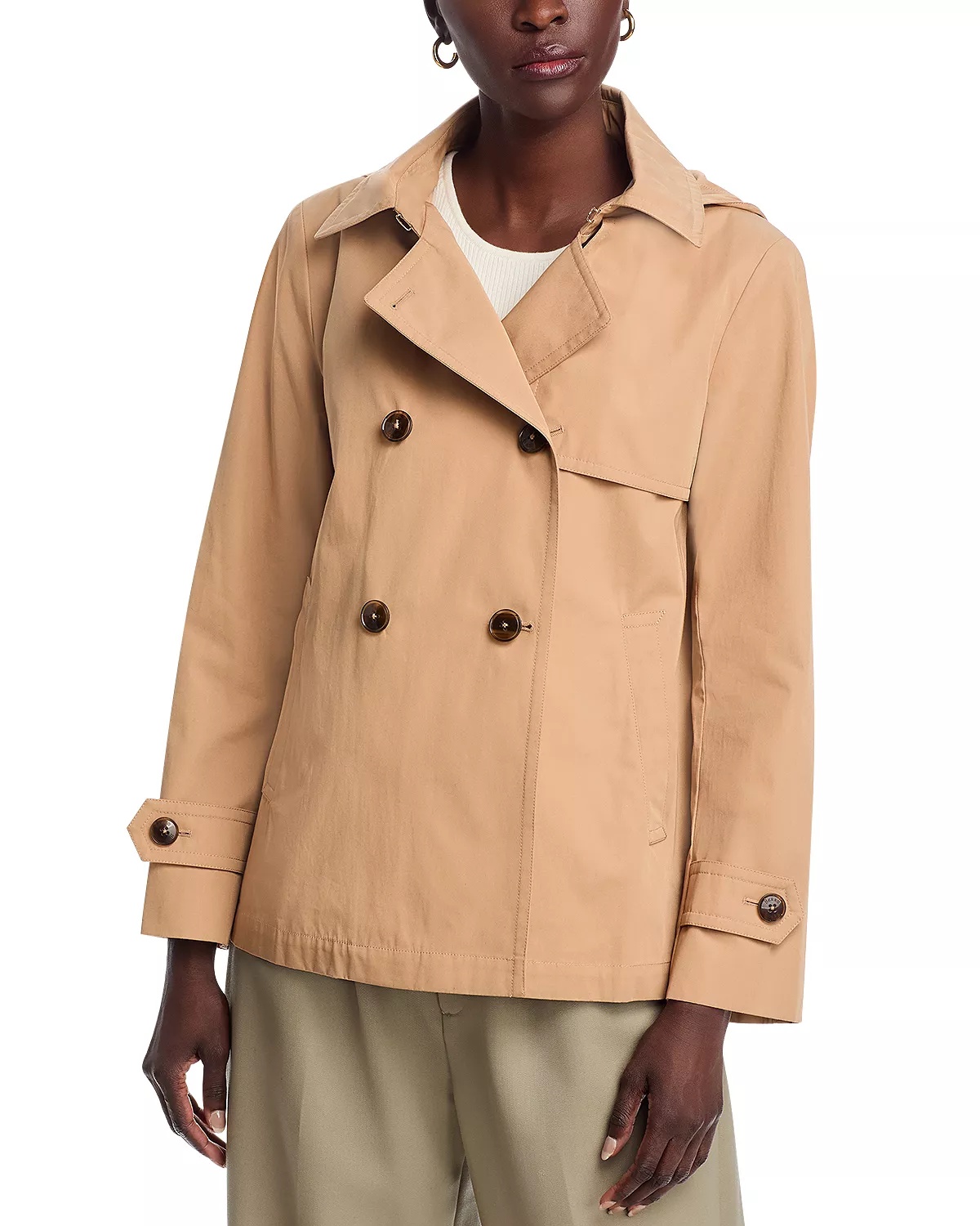 SIZE & FIT - Fits true to size, order your normal size - Model measurements: 5'10" height, 33" bust, 25" waist, 35" hips PRODUCT DETAILS - Notched lapel; hood - Front button closures - Long sleeves with belted cuffs - Two front slanted pockets - Lined - Storm flaps at front and back - Imported Web ID: 5406423 MATERIAL & CARE - 100% cotton; lining: 100% viscose; secondary lining: 65% acetate/35% polyester - Dry clean