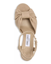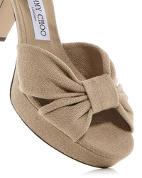 SIZE & FIT - Founded in 1996, Jimmy Choo creates luxury handbags, shoes, accessories, and fragrances with an empowered sense of glamour and a playfully daring spirit. - Seamlessly blending innovative with time-honored techniques, Jimmy Choo is known as much for its exceptional craftsmanship as it is for its confident style, making the brand a favorite among celebrities and A-listers in every corner of the globe. - Together, CEO Hannah Colman and Creative Director Sandra Choi have built a global powerhouse rooted in glamour, optimism, and joy. - And it is with this in mind that the brand created Project Optimism--a sustainability manifesto that will help guide Jimmy Choo toward developing more sustainable products with the same joie de vivre the brand has become synonymous with. PRODUCT DETAILS - Runs small, order a half size up - Open square toe - Buckled ankle strap - Knot detail at toe - 3.25" block heel, 1" platform, feels like a 2.25" heel - Leather or linen upper - Leather lining and sole - Made in Italy Web ID: 5290942