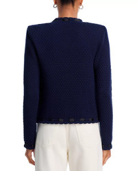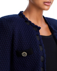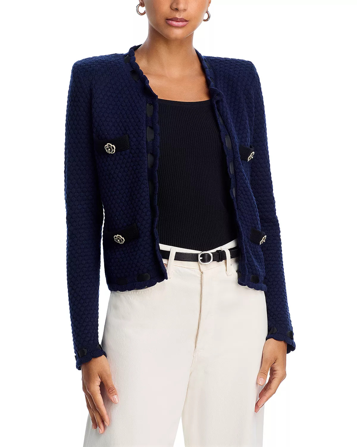 PRODUCT DETAILS - Scalloped round neckline - Long sleeves, scalloped cuff with contrast-ribbon - Open-front style, scalloped front placket with contrast ribbon - Four front non-functional pockets with floral-embellished buttons - Textured knit - Scalloped hemline - Imported Web ID: 5212342 MATERIAL & CARE - 60% cotton/30% nylon/10% wool - Dry Clean