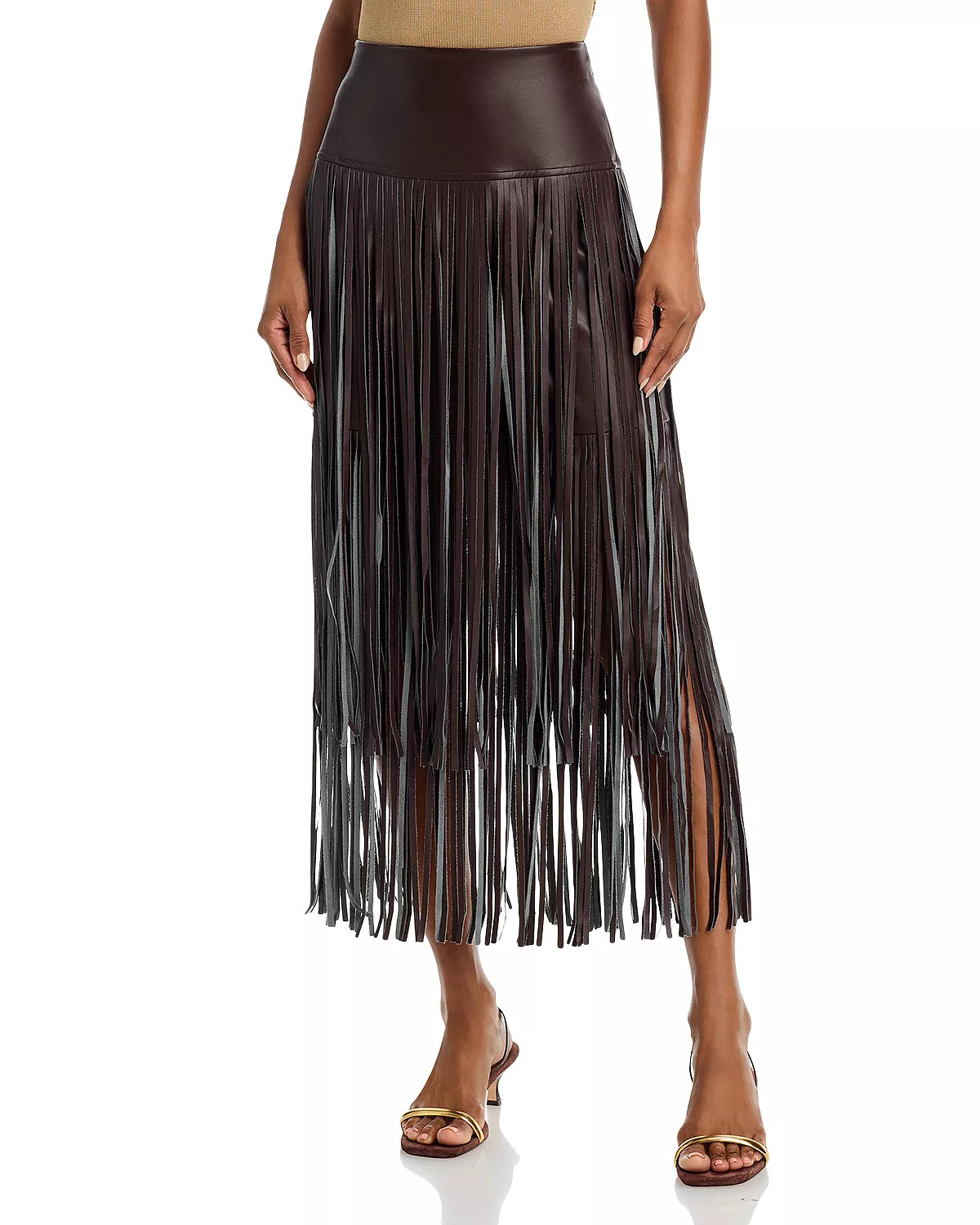 SIZE & FIT - Fits true to size, order your normal size - Model measurements: 5'8" height, 32" bust, 24.5" waist, 34" hips, wearing a size 2 - Approx. 39.5" long PRODUCT DETAILS - Back zipper closure - Faux leather fabric - Layered fringed hem - Imported Web ID: 5708081 MATERIAL & CARE - 50% polyurethane/50% polyester - Dry clean