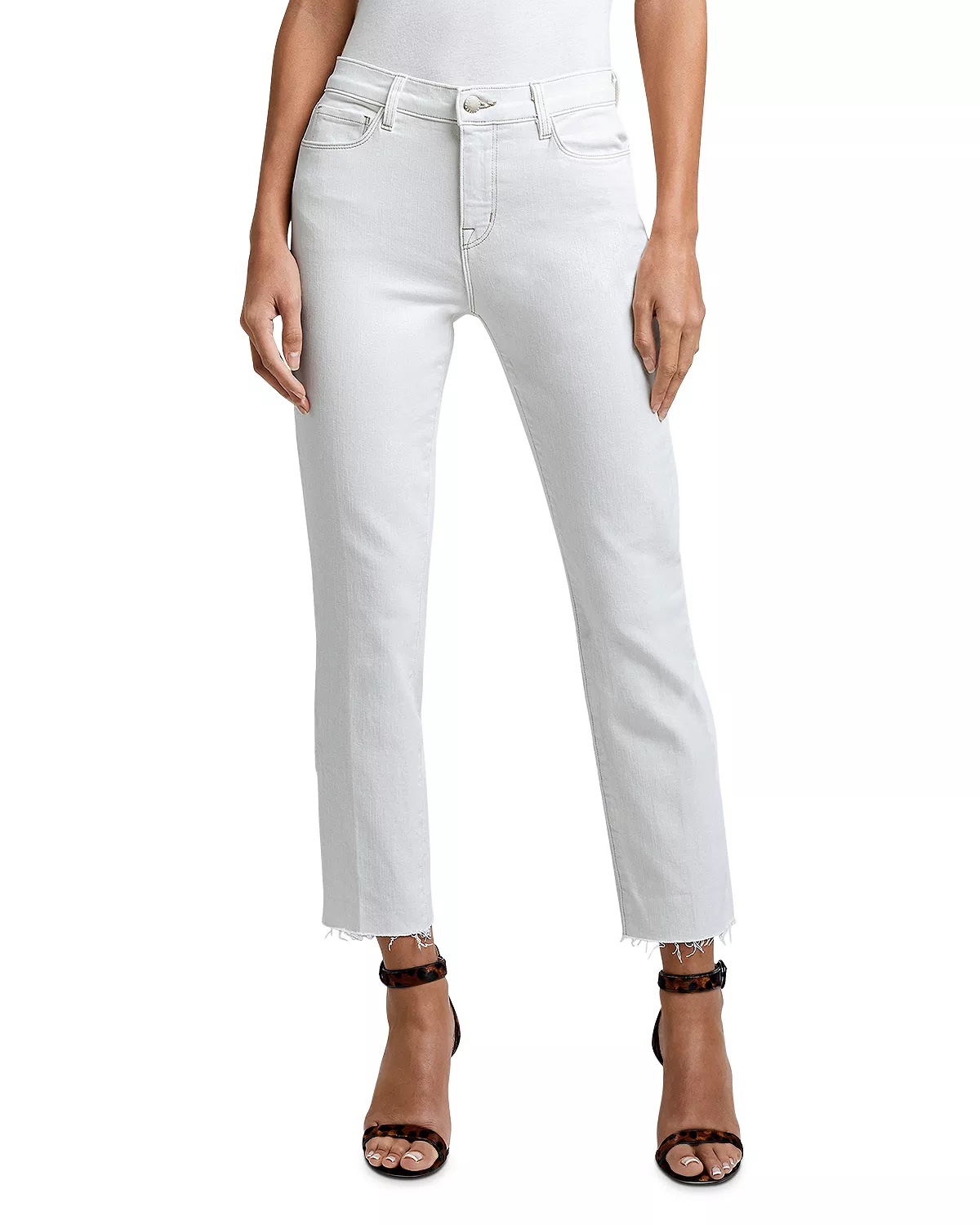 SIZE & FIT - Fits true to size, order your normal size - Mid rise: 9.25" - Cropped inseam: 26" - Leg opening: 12" - All measurements based on a size 26 - Model measurements: 5'10" height, 33.5" bust, 23.5" waist, 34.5" hips, wearing a size 26 PRODUCT DETAILS - Zip fly with button closure, five-pocket silhouette - Belt loops, contrast stitching, silver-tone hardware - Slim-leg silhouette - Cropped, raw-edge hems - Made in USA Web ID: 4284851 MATERIAL & CARE - 93% cotton/6% polyester/1% spandex - Dry clean