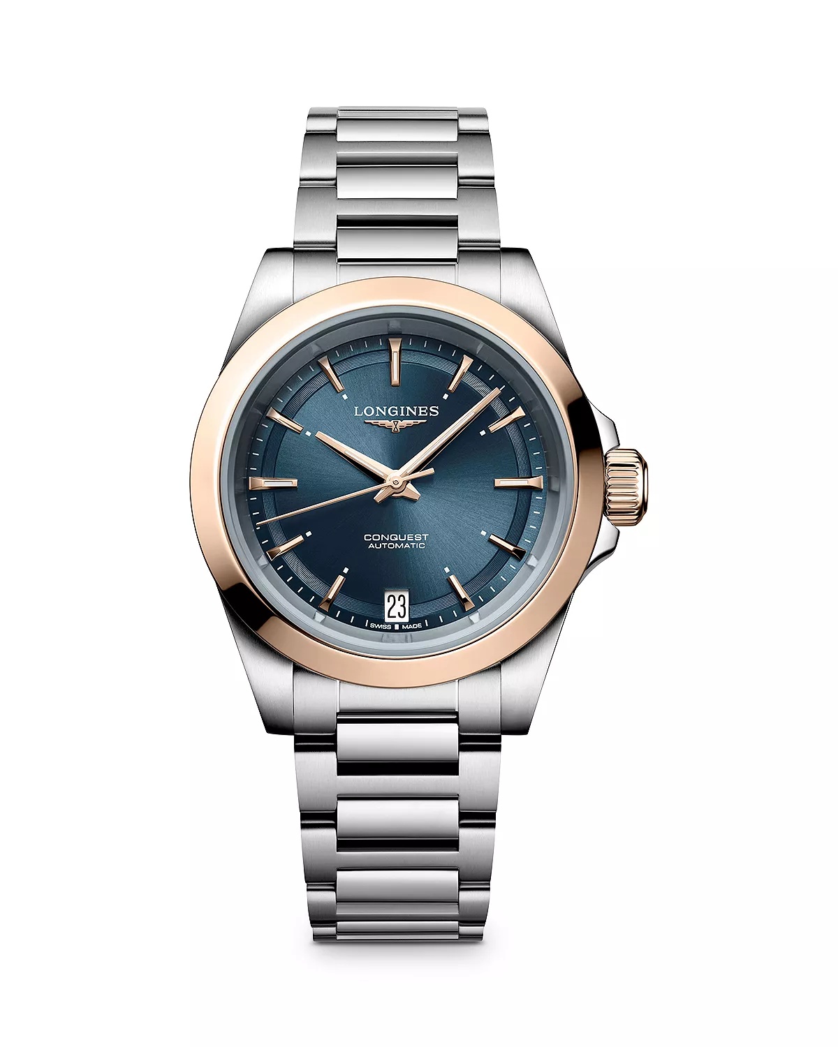 PRODUCT DETAILS - Stainless steel and 18K rose gold; stainless steel; sapphire crystal - Case size: 34mm - Triple safety folding clasp and push-piece opening mechanism - Water resistant to 10 ATM - Swiss automatic movement - Blue sunray dial with a date display at 6 o'clock - 18k rose gold cap - Stainless steel link bracelet - Manufacturer's 5-year international warranty - Photo may have been enlarged and/or enhanced. - Made in Switzerland Web ID: 5222558